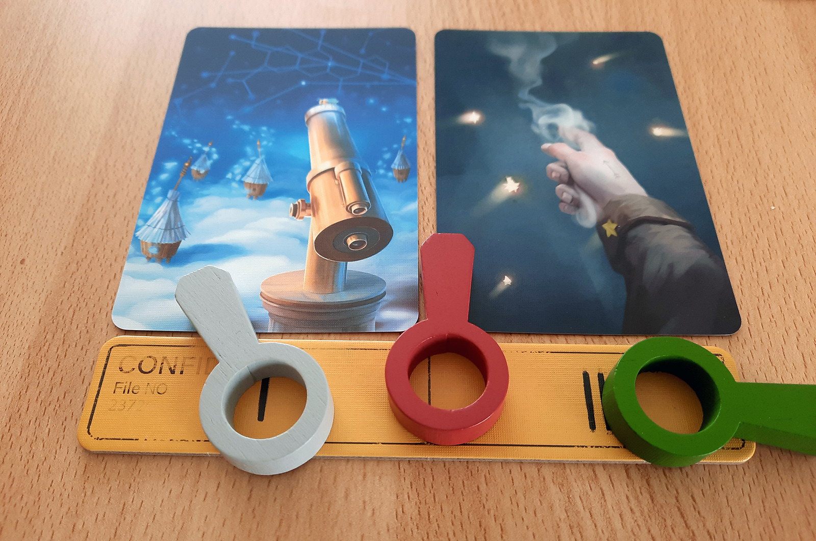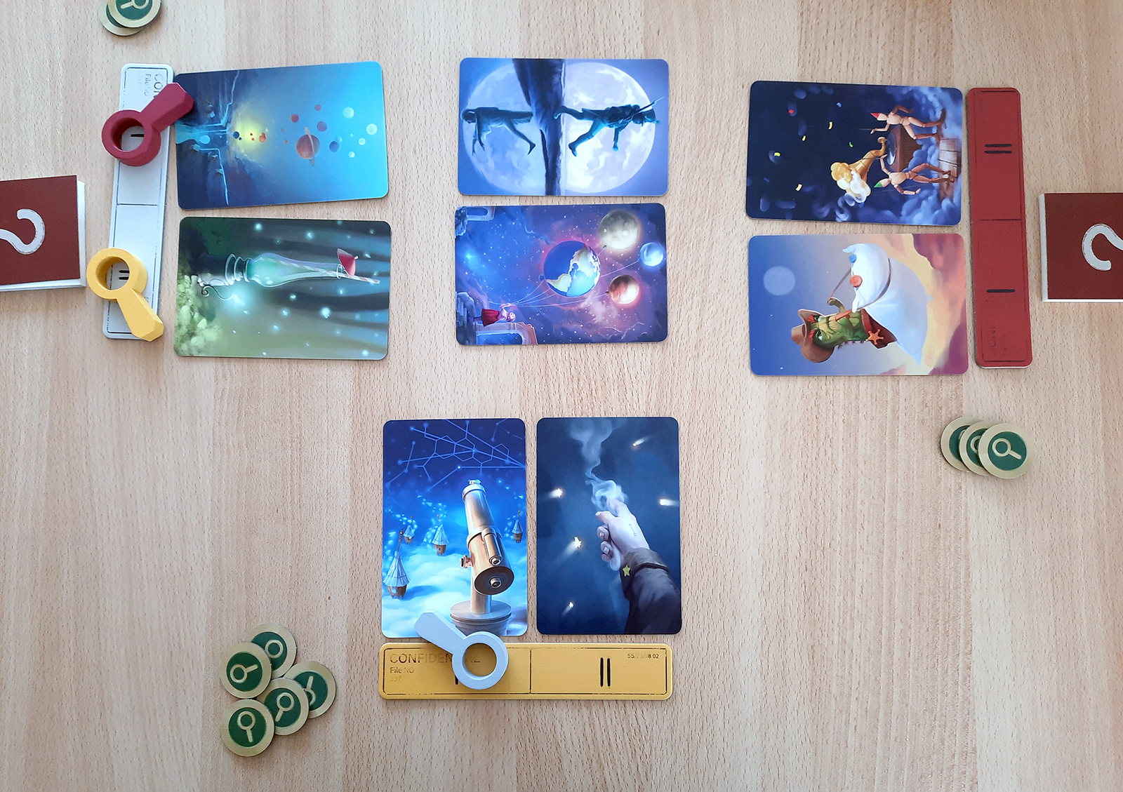 Haben alle Spieler:innen Karten ausgespielt, wird der Begriff offen genannt und jede:r erklärt, warum er diese oder jene Karte ausgespielt hat. Die ideale Möglichkeit, damit sich Verschwörer:innen herauszureden können. Anschließend werden Verdächtigungen ausgesprochen, indem jede:r Spieler:in eine Lupe vor dem:der vermeintlichen Verschwörer:in ablegt. Je nachdem ob er:sie enttarnt wurde, erfolgt die Punkteverteilung. Nach ein bis zwei Runden, in denen jeder einmal beginnen durfte war, wird ausgewertet, wer gewinnt.