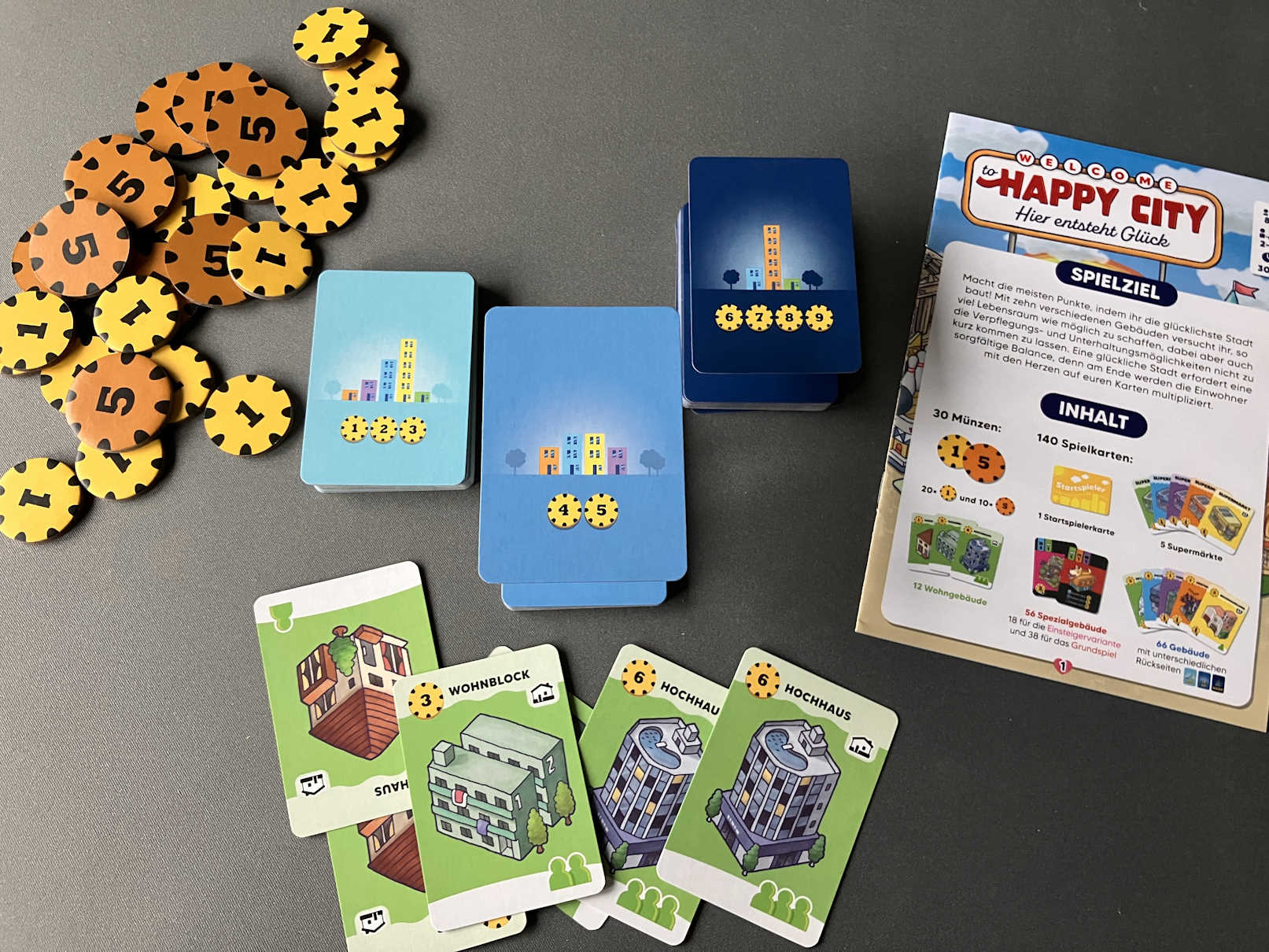 Die kleine Spielschachtel hat es in sich! Viele bunte Karten und Pappmünzen. Das erinnert irgendwie an andere Städtebau-Spiele mit bunten Karten und hat zugleich eine dringende Einladung doch sofort loszuspielen! Würfel? Fehlanzeige! Die braucht es nicht um glücklich zu sein!