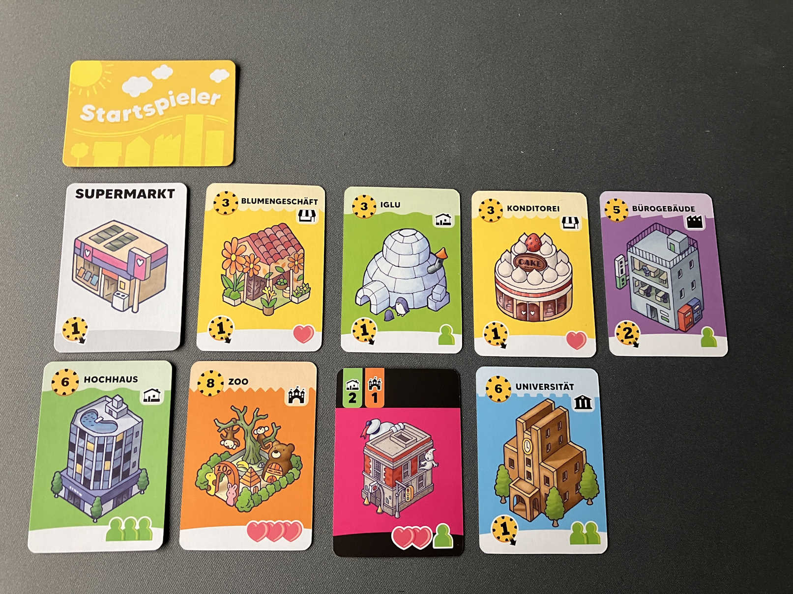 Zu Beginn einer Runde erhalten alle Personen Einkommen. Das erschließt sich auf einen Blick am Unterrand der Gebäude – ist hier eine Münze abgebildet, gibt es Geld, sonst nicht. Dann darf ein Gebäude aus der Auslage gekauft werden, die Kosten sind oben links auf den Karten abgebildet. Jedes Gebäude darf in jeder Stadt nur 1x vorkommen und wenn die Bedingung eines Sondergebäudes erfüllt wird, dann darf dieses zugleich sofort in die eigene Stadt gelegt werden. Sondergebäude sind erkennbar durch den pinken oder roten Hintergrund und dürfen nur 1x in jeder Stadt vorkommen.