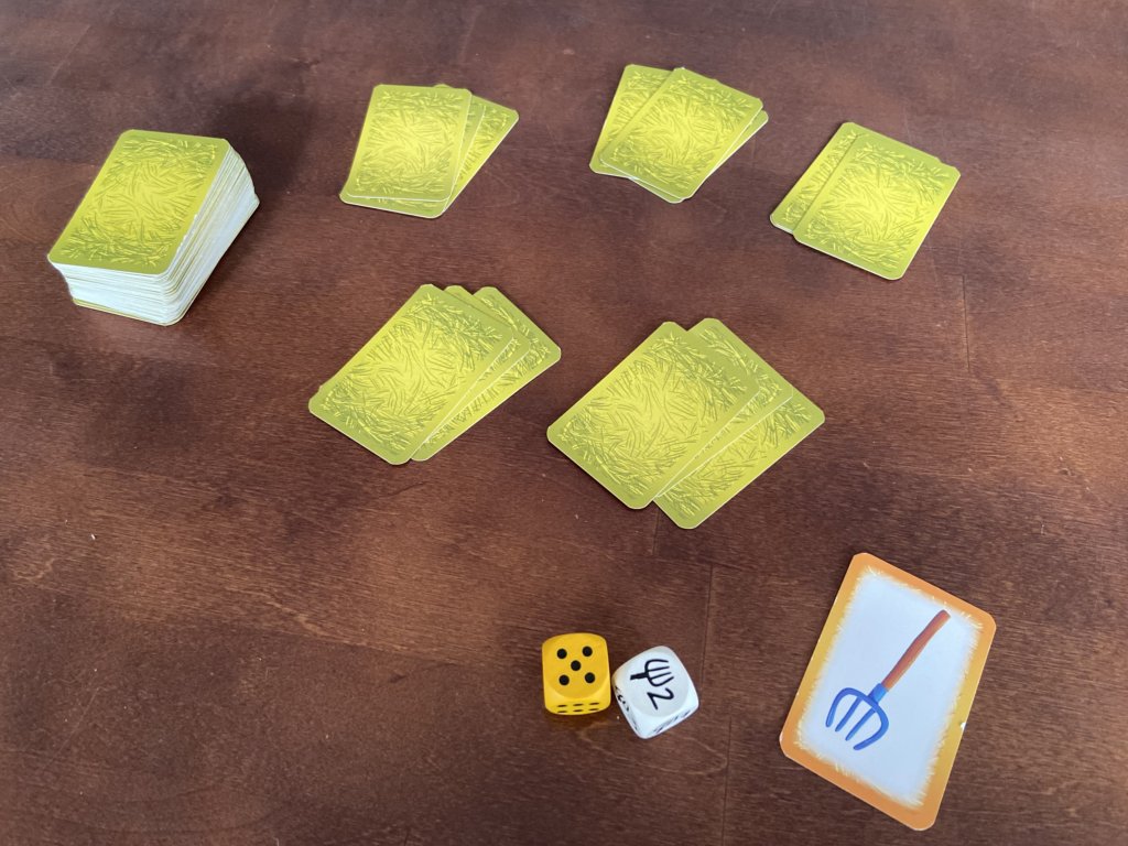 Zunächst werden die Heugabel (eine Karte) und die Würfel zur Seite gelegt. Dann werden 15 Karten in Stapeln zu je 3 verdeckt auf dem Tisch verteilt. Daneben kommt der Nachziehstapel mit den restlichen Karten.