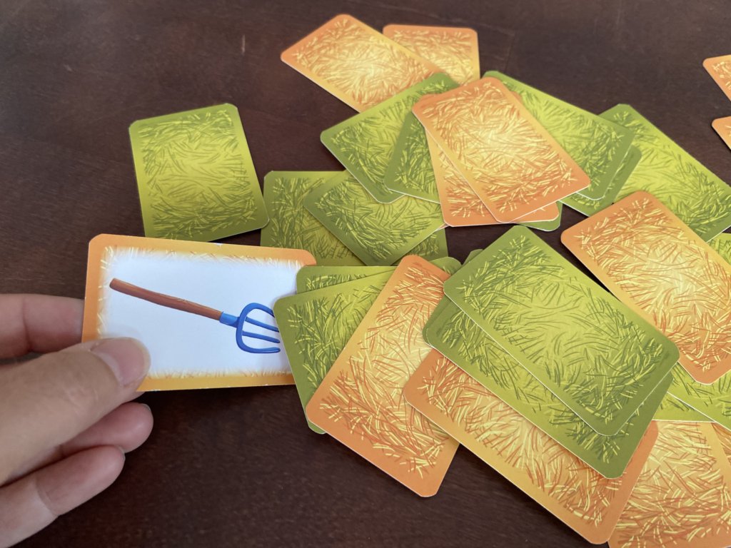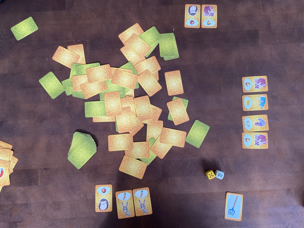 Wer am Zug ist würfelt und wählt einen der beiden Würfel aus: gelb bedeutet Karten nehmen und hochwerfen, weiß bedeutet mit der Heugabel (die Karte) Karten die bereits auf dem Tisch liegen hochschaufeln. In beiden Fällen versucht man möglichst viele Karten offen liegen zu haben. Dann darf ich nämlich Tiere zu mir nehmen und mit Futter die Tiere meiner Mitspielenden zu mir locken. Alle offenen Futterkarten kommen am Ende meines Zuges aus dem Spiel. So wandern die Tiere im Laufe der Partie immer ihrem Lieblingsfutter nach.