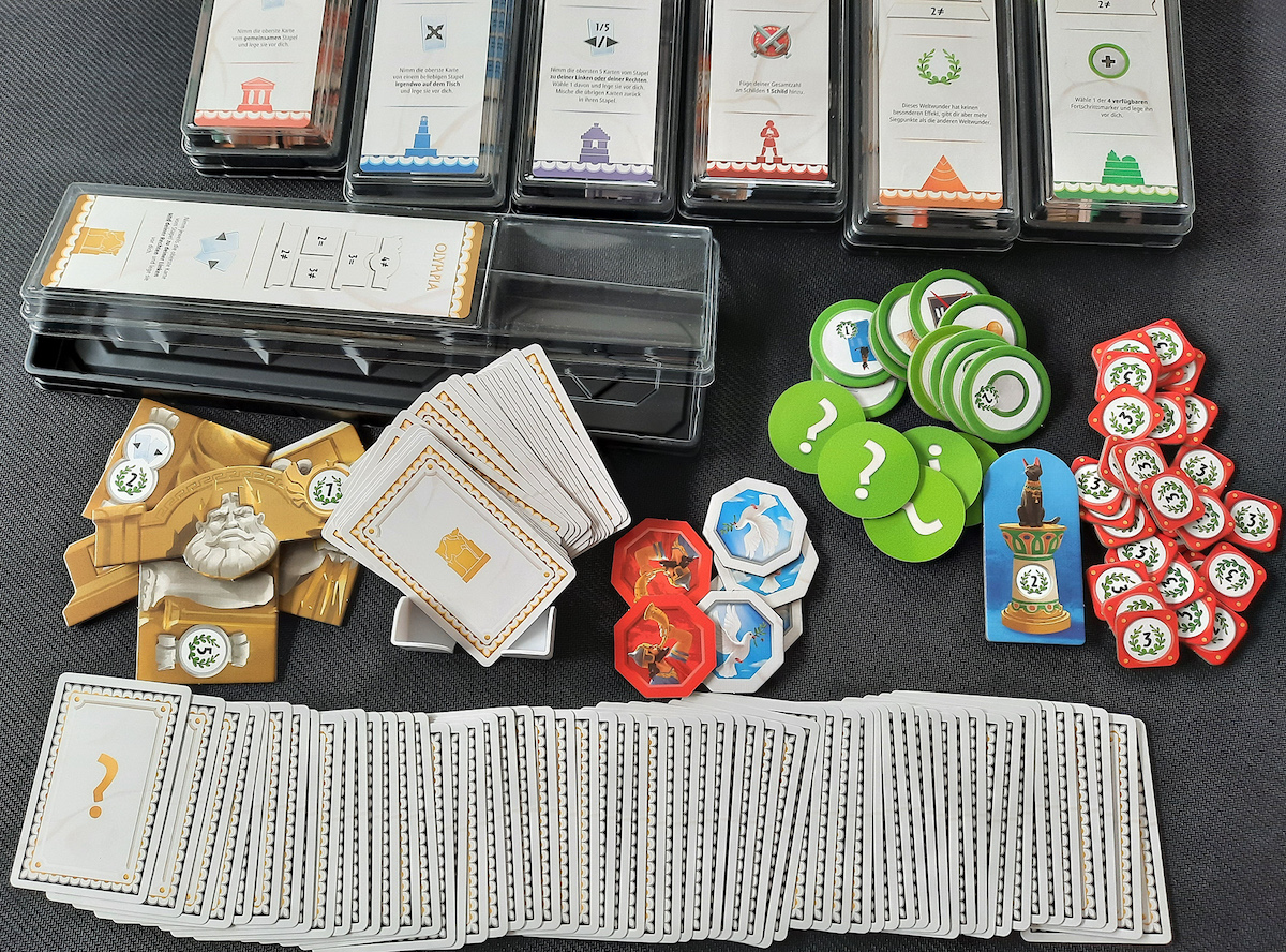 Das Spielmaterial besteht aus hochwertig produzierten und stabilen Pappmarkern und Karten. Alles kann perfekt und sortiert in mitgelieferten Plastikboxen aufbewahrt werden. Die einzelnen Symbole sind deutlich hervorgehoben und klar erkennbar. Die Bauteile der einzelnen Weltwunder sind stabil und handlich und somit leicht auf dem Tisch zu greifen und umzudrehen. Die unterschiedlichen Farben sind zusätzlich mit Symbolen unterscheidbar. Die Spielregeln sind sehr übersichtlich und klar strukturiert, auf einer Seite sind alle Effekte der Marker ausführlich beschrieben.