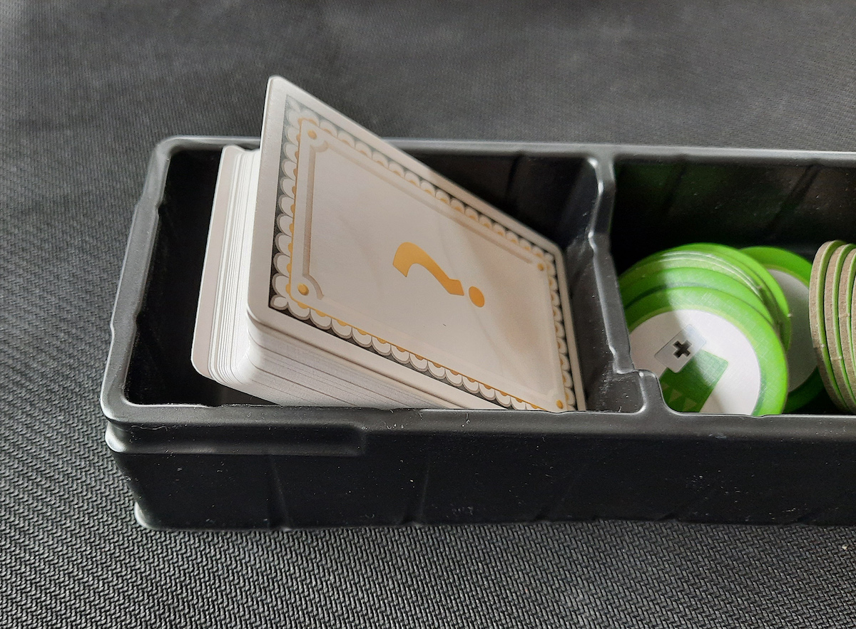 Dem Verlag ist es gelungen, das Spielmaterial hochwertig, übersichtlich und generationsübergreifend spielbar zu produzieren. So kann man in der Kartenaufbewahrungsbox die Karten einfach entnehmen, indem man auf eine Seite der Karten drückt und die andere Seite wird dabei zum Entnehmen hochgehoben.