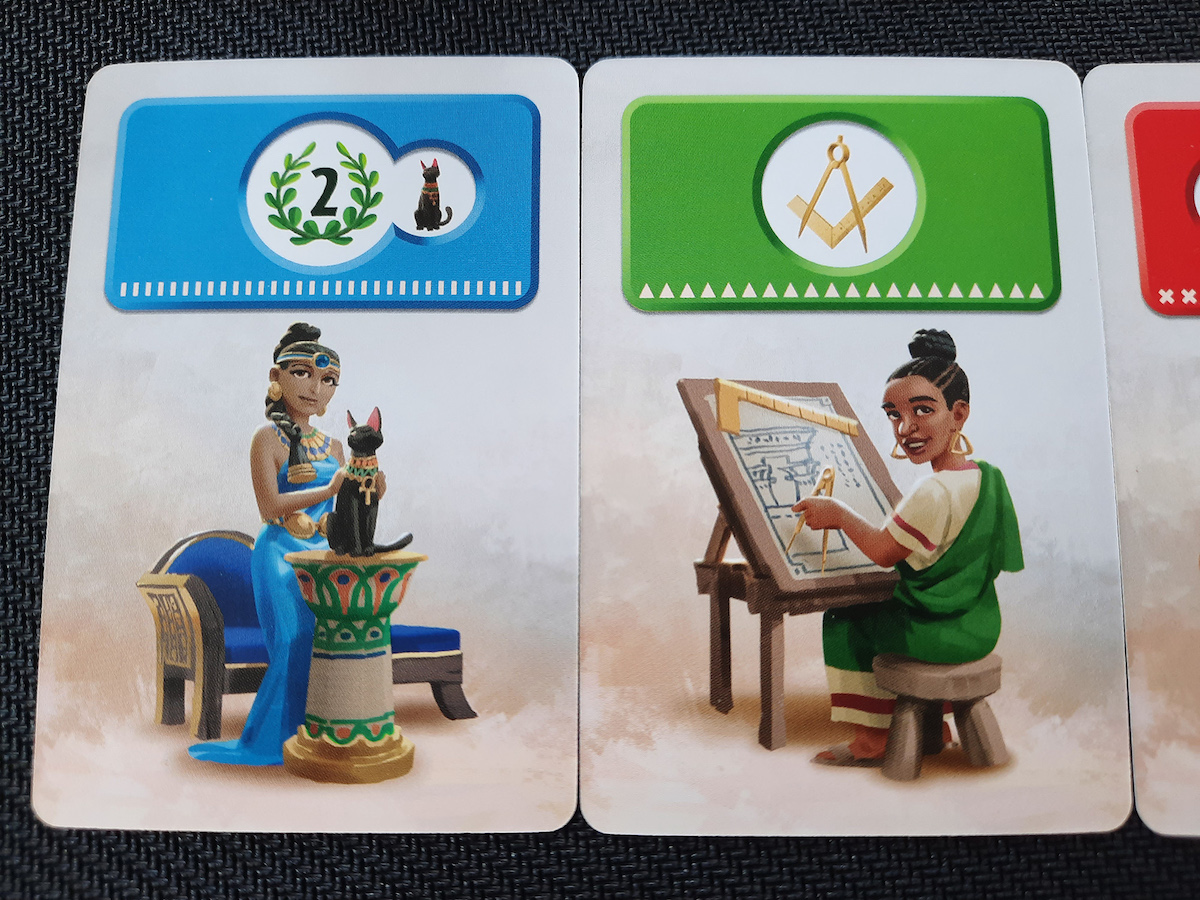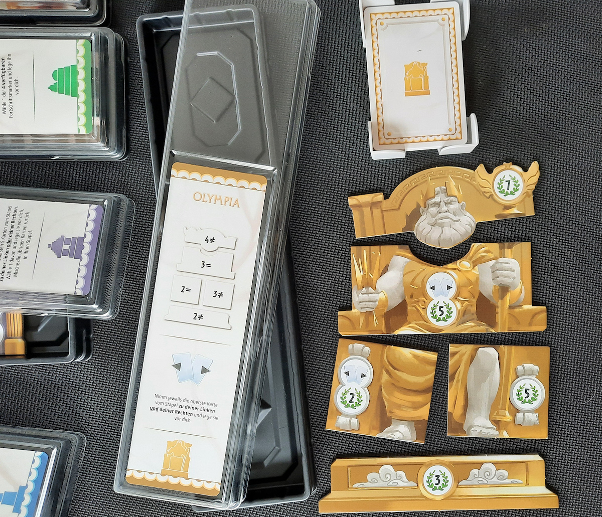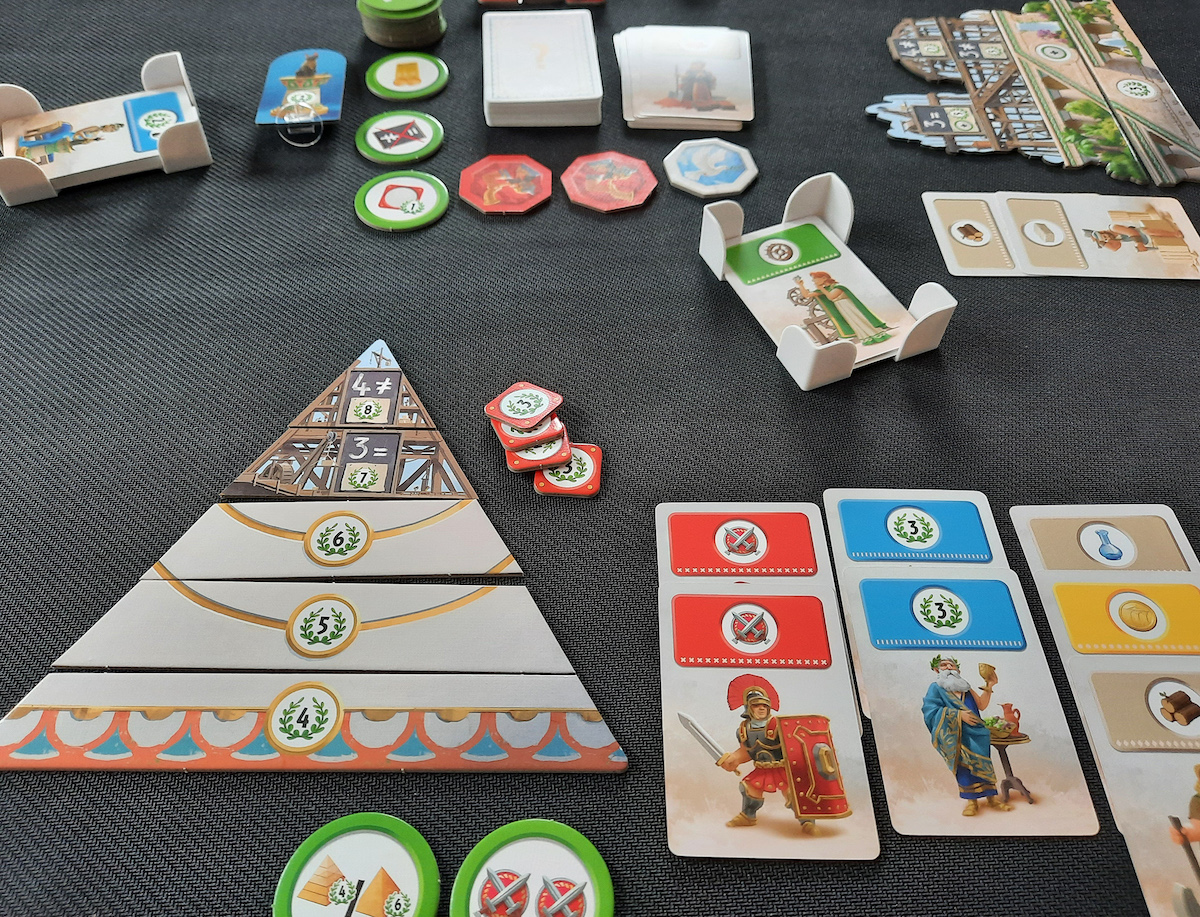 Alle Mitspielenden bauen ihr Weltwunder. Den Baufortschritt sieht man vor sich. Das ist motivierend und befriedigend. Hier kann klar gesehen werden, was im Spiel passiert. Die Entscheidungen sind sehr leicht. Ziehe ich vom linken oder rechten Stapel – hier sehe ich die Karte, die ich ziehen kann – oder ziehe ich vom verdeckten Stapel in der Mitte. Ein Spielzug ist somit einfach strukturiert, auch die Entscheidung ist nicht komplex oder kompliziert. Dennoch bedarf es etwas Planung und dem Beobachten der anderen Mitspielenden, jedoch nur der beiden benachbarten.