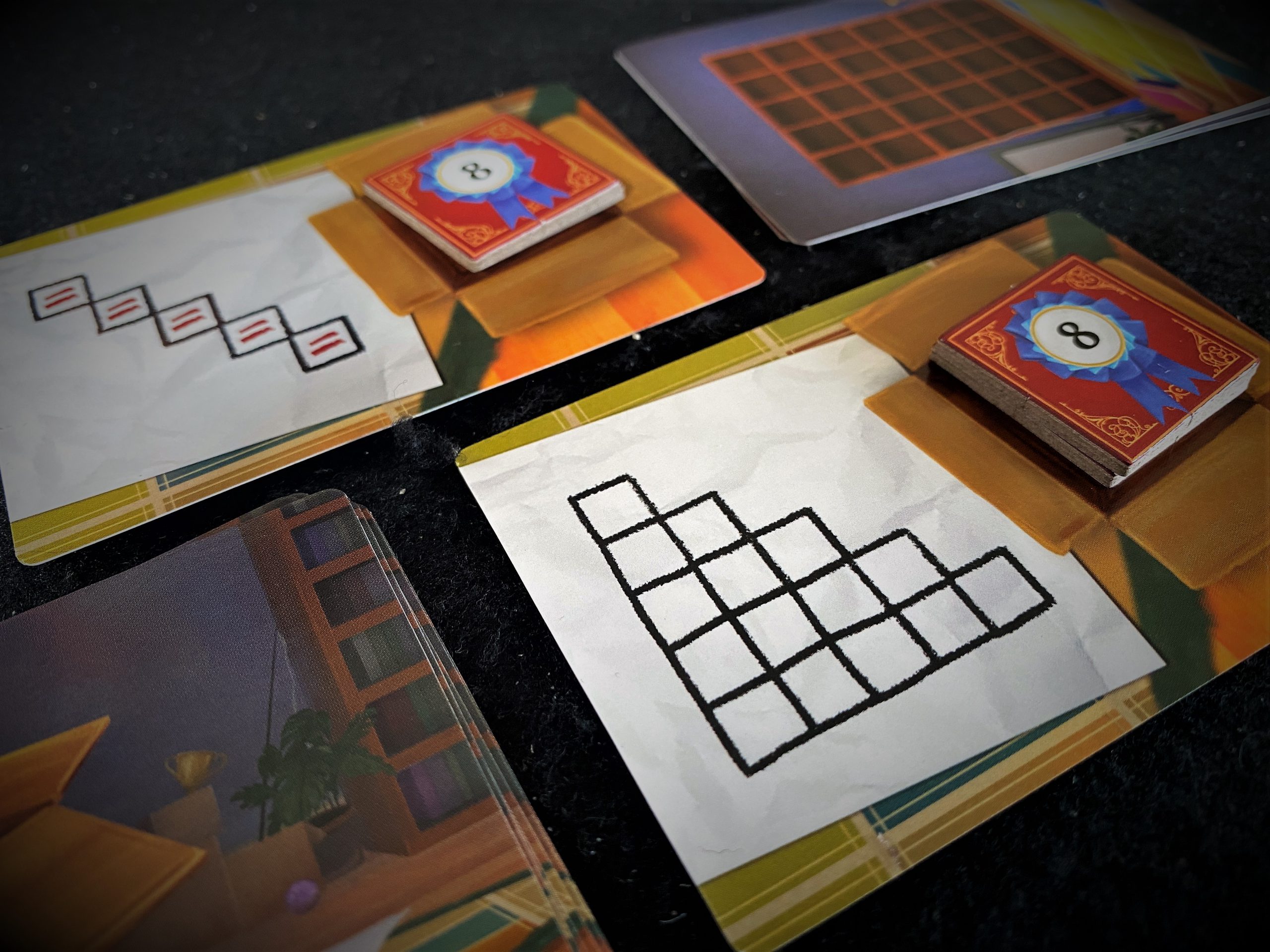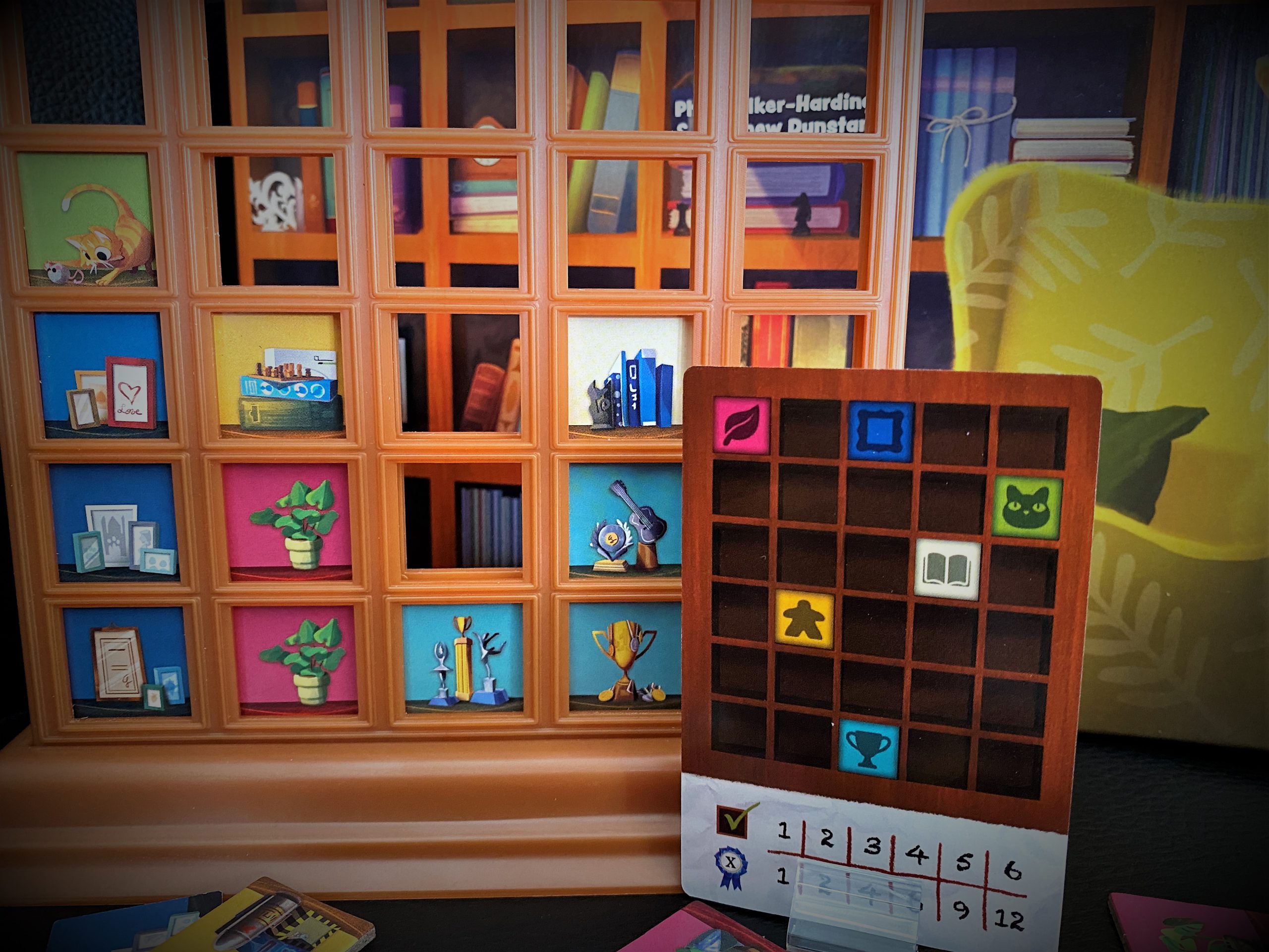 Zusätzlich haben alle auch einen geheimen Auftrag. Dieser zeigt dein Regal in einer verkleinerten Darstellung. An sechs Stellen leuchten dir Farbtupfer entgegen. Deine Aufgabe ist es nun, in deinem Regal möglichst viele farbige Übereinstimmungen zwischen Karte und Regal hinzubekommen. Je mehr du davon schaffst, desto mehr Punkte gibt es am Schluss. Alle haben unterschiedliche geheime Aufträge. Manchmal ist es ein bisschen schwierig, die Anordnung auf der Karte genau zu erkennen. Insbesondere wenn der Raum nicht hell beleuchtet ist, habe ich Schwierigkeiten die blauen, gelben und weißen Farbtupfer zu erkennen. Da hilft es aber die Karte kurz vor die Nase zu halten.