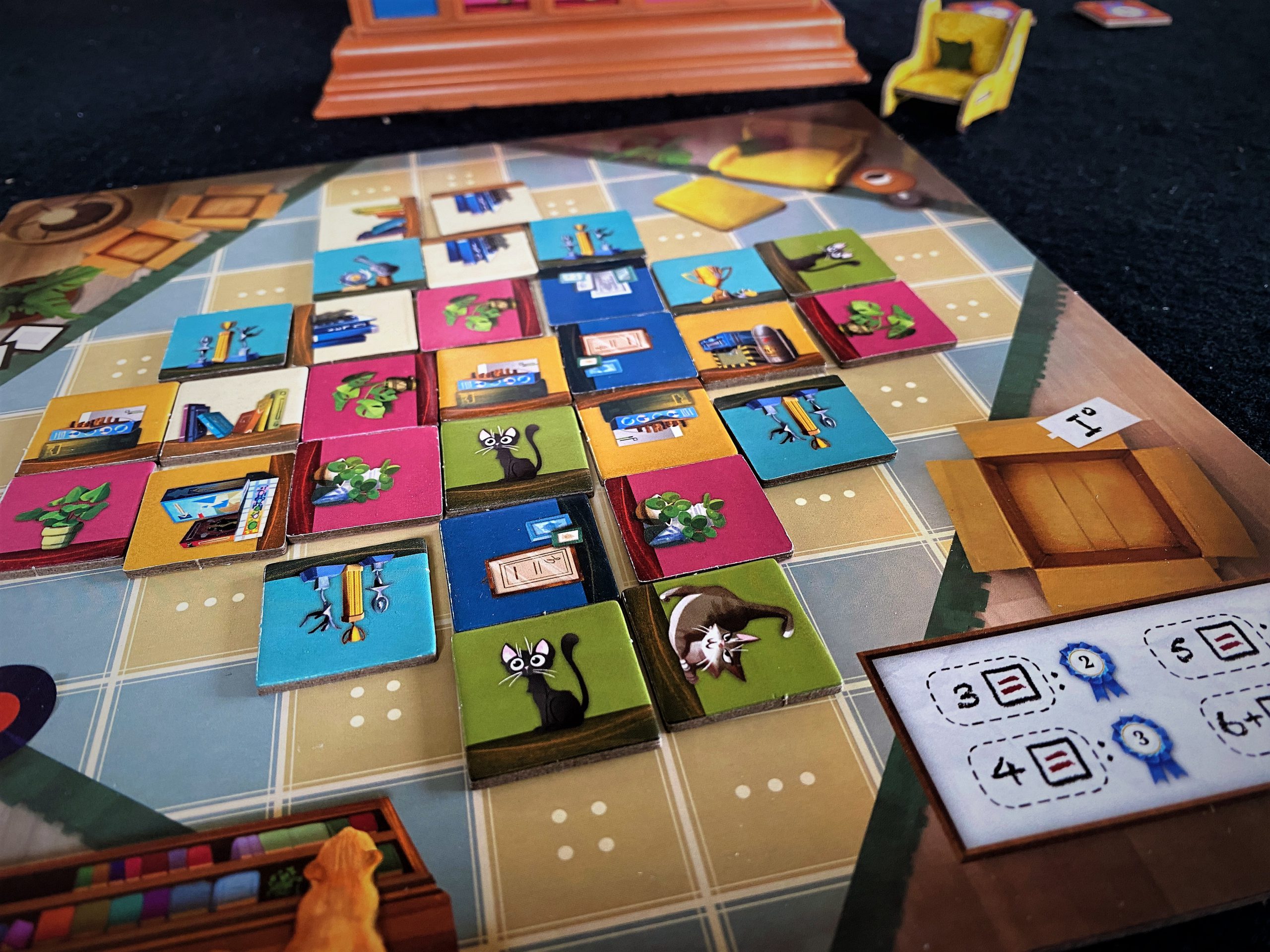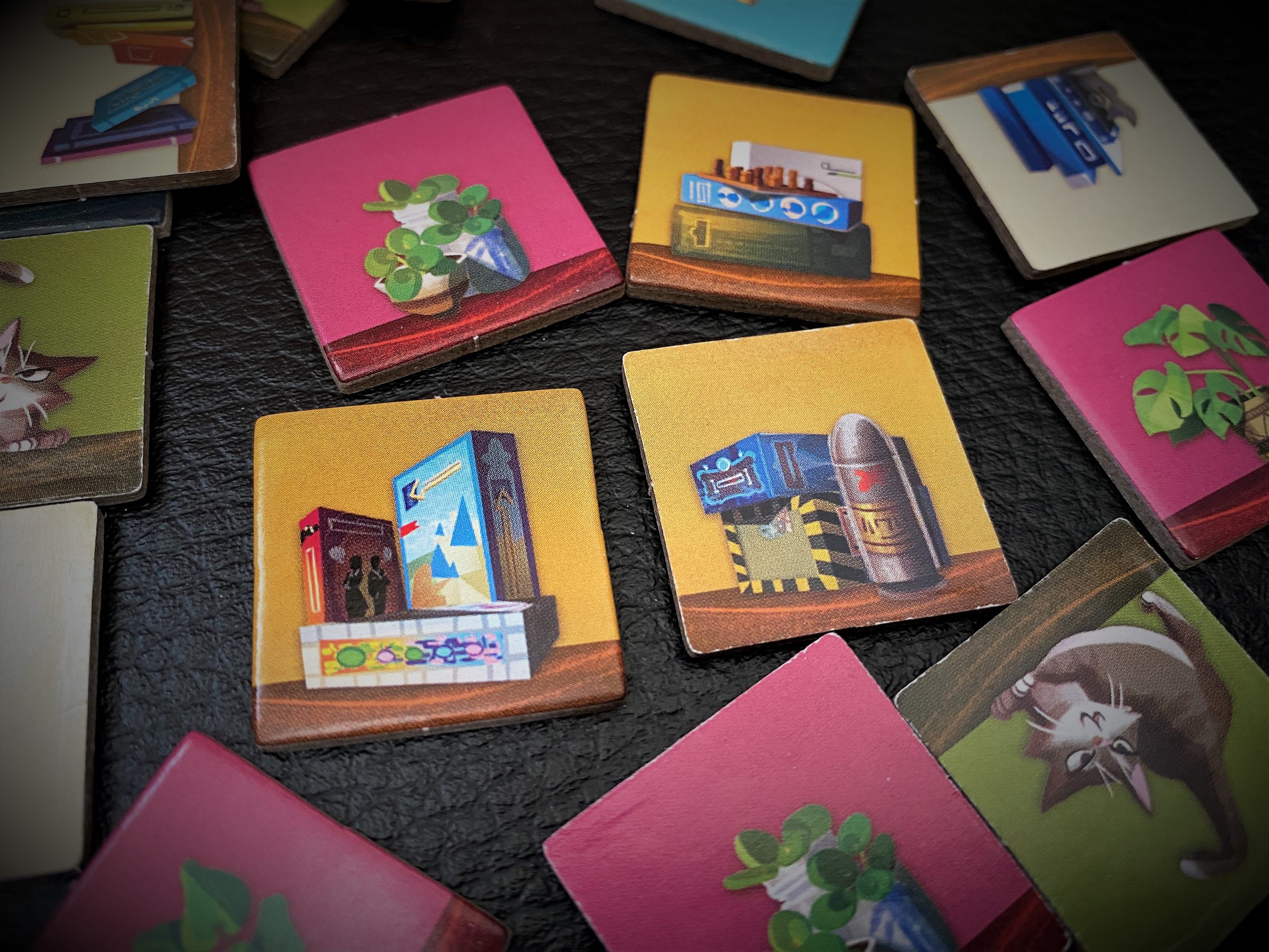 Bist du an der Reihe, nimmst du dir ein, zwei oder drei Plättchen aus der offenen Auslage. Die Anzahl entscheidest du selbst. Die Bedingung dabei ist aber, dass die Plättchen in einer Reihe liegen und jedes eine freie Kante hat. Die Plättchen gibt es in sechs verschiedenen Farben, und jede Farbe hat unterschiedliche Illustrationen. Auf den grünen findest du niedliche Katzen, die türkisfarbenen zeigen Pokale, auf den weißen sind Bücher und so weiter. Wenn du dich gut mit Brettspielen auskennst, schau‘ dir doch mal die gelben Plättchen genauer an. Na, wie viele der Brettspiele, die darauf abgebildet sind kannst du benennen? Übrigens spielen die Illustrationen keine Rolle im Spiel, sondern sind nur ein kleiner Augenschmaus. Wichtig sind die Farben. Bei einer Farbfehlsichtigkeit helfen dir aber die unterschiedlichen Themen.