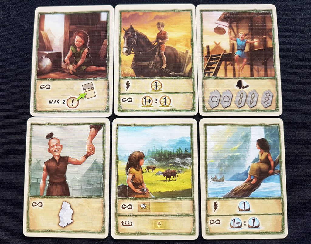 Und noch was richtig Tolles. Jeder hat natürlich seine Spezialfähigkeit, die ihn von den anderen Spielern unterscheidet. Und jetzt kommt das Geniale. Zuerst startet man als Kind mit bestimmten Fähigkeiten. Irgendwann beschließt man, alt genug zu sein, und man wendet seine Karte und hat plötzlich ganz andere Fähigkeiten. Das ist so einfach und doch so stark gemacht. So erlebt man das Spiel richtig als Geschichte. Man altert, man entdeckt die Landschaft, man bewegt sich mit den Karren und auf dem Fluss weiter. Das ist alles so stimmig in dieses Spiel eingebaut, dass es einem richtig mitnimmt und hineinzieht.