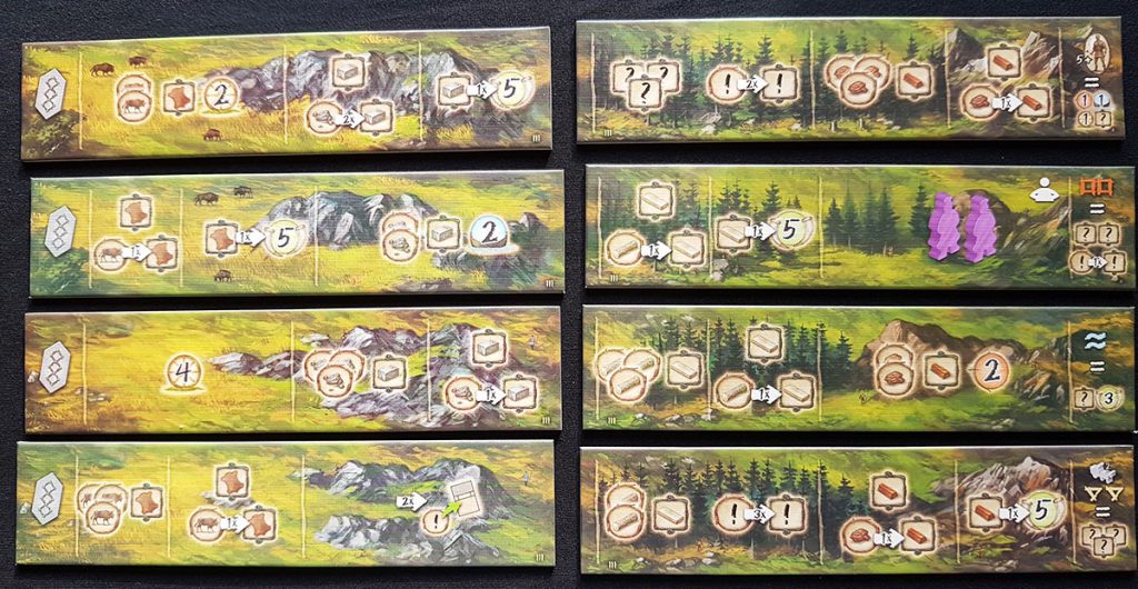 Was noch dazu kommt. Der Spielplan mit den Geländeplättchen wird jedesmal neu zusammengestellt. Auch Belonungsplättchen werden jedes Spiel neu verteilt. Soviel Varianz in einem eh schon üppigen Spiel – wow! Das muss oft auf den Tisch, bis man wirklich jeden Weg einmal probiert hat.