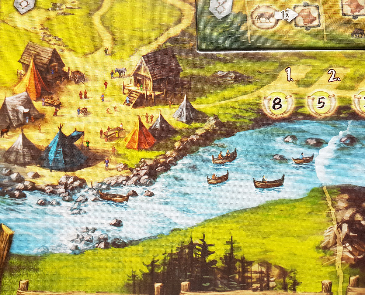 Es ist ein Arbeiter-Einsetz-Spiel. Über fünf Runden setze ich abwechselnd mit den anderen Spielern einen Kundschafter oder meinen Häuptling in mein Heimatgebiet, ein neues Territorium, auf die Straße, ein Sonderfeld oder meine Hütte ein. Raffiniert ist dabei, dass manche Felder zwei Kundschafter zulassen, aber mit einem Häuptling blockiert man das zweite Feld für die Mitspieler. Noch etwas ist tricky. Es gibt fünf neue Gebiete, die zwar für Kundschafter erreichbar sind, aber am Ende kehren nur die zurück und sind wieder einsetzbar, die auf Gebieten eingesetzt wurden, die bereits freigespielt sind. Und das in in jeder Runde immer nur ein weiteres Gebiet. Man kann sich also gute Aktionen von späteren Gebieten holen, verliert aber damit einen Kundschafter für die nächsten Runden.