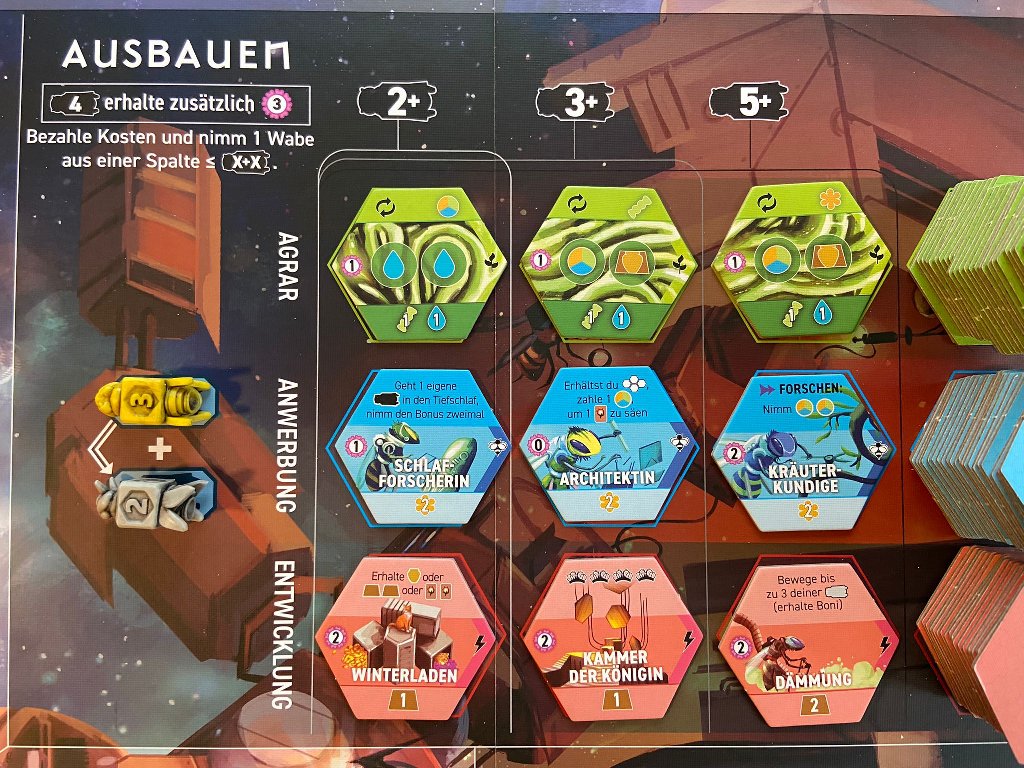 Die Aktion Ausbauen beschreibt den Ausbau unseres eigenen Apiary. Hierzu tauschen wir für Ressourcen Plättchen aus der Auslage und vergrößern unser Gebiet: grüne Farmen geben Einkommen wenn wir unsere Bienen zurückholen, blaue Plättchen verbessern überwiegend andere Aktionen, rote Entwicklungsplättchen bieten Sofortboni die sehr attraktiv sind.