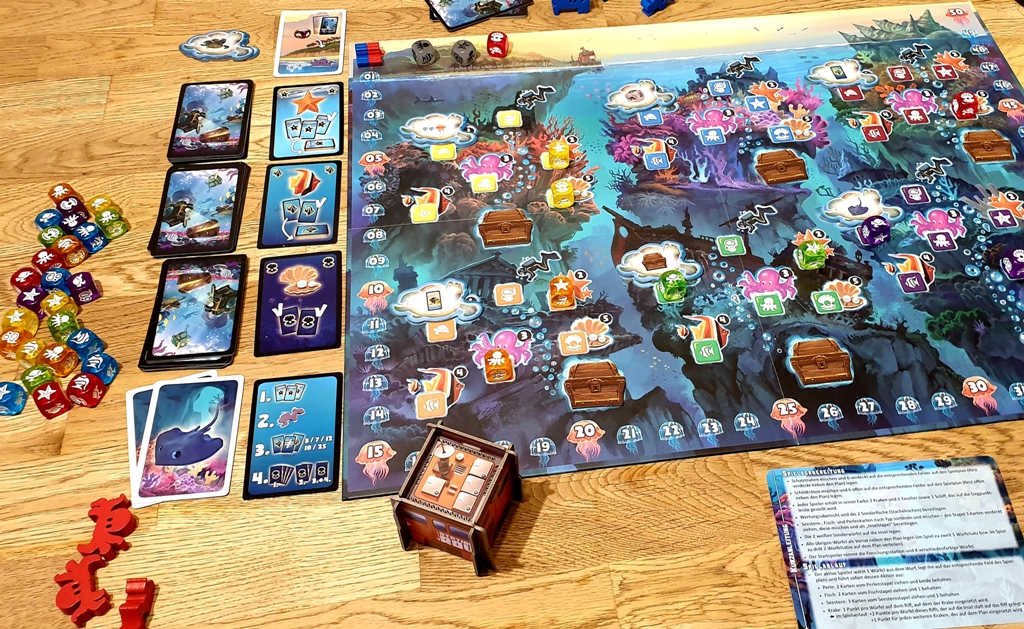 Und Seesterne bieten Aufgaben, die man am Spielende erfüllen kann, um Punkte zu erhalten oder geben tolle Boni. Die SpielerInnen können aber auch den/die TaucherIn bewegen, um Schätze zu heben, die auch wieder Vorteile verschaffen oder den Kraken einsetzen, um für jeden Würfel dieses Riffs Punkte zu ergattern.