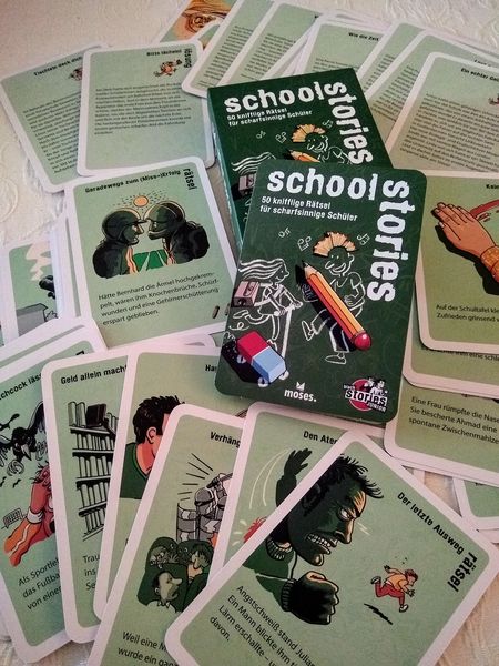 school stories – 50 knifflige Rätsel für scharfsinnige Schüler | Gruppenspiele | ab 8 Jahren | 2 bis 20 Spielende | Corinna Harder | moses Verlag |  generationentauglich