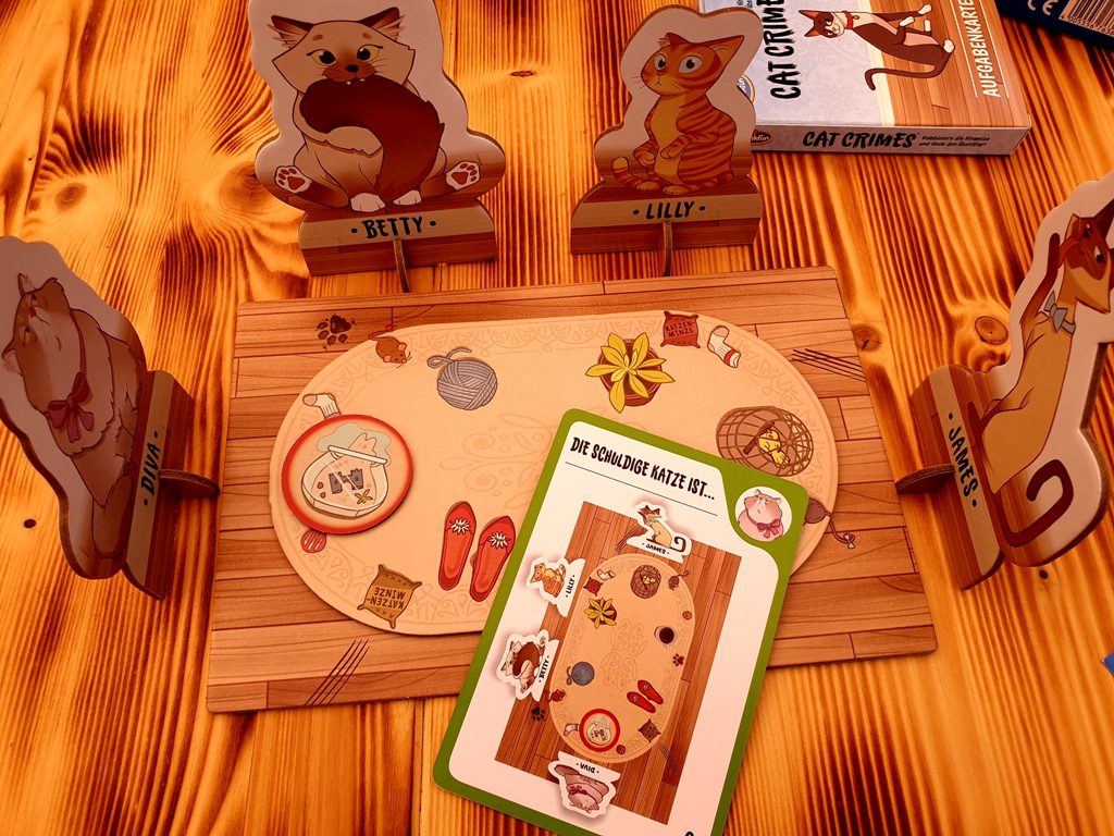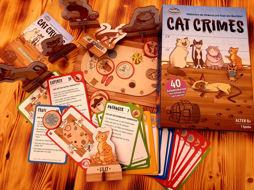 In Cat Crimes gilt es den Täter zu entlarven. Welche Katze hat den Vogelkäfig geleert und wer hat die Vase heruntergeschmissen? Hierzu findet man 40 Aufgabenkarten in verschiedenen Schwierigkeitsstufen vor. Auf diesen steht, welches Unglück passiert ist sowie weitere Hinweise. Aus diesen kann man entnehmen oder ableiten, welche Katze beteiligt ist und wo diese sitzt. Natürlich fehlen einige Informationen. Es gilt sodann, die richtigen Sitzplätze der kleinen Tiger herauszufinden und den Täter zu überführen. Da die Lösung auf der Rückseite der Aufgabenkarte steht, kann der Lösungsvorschlag wunderbar überprüft werden.