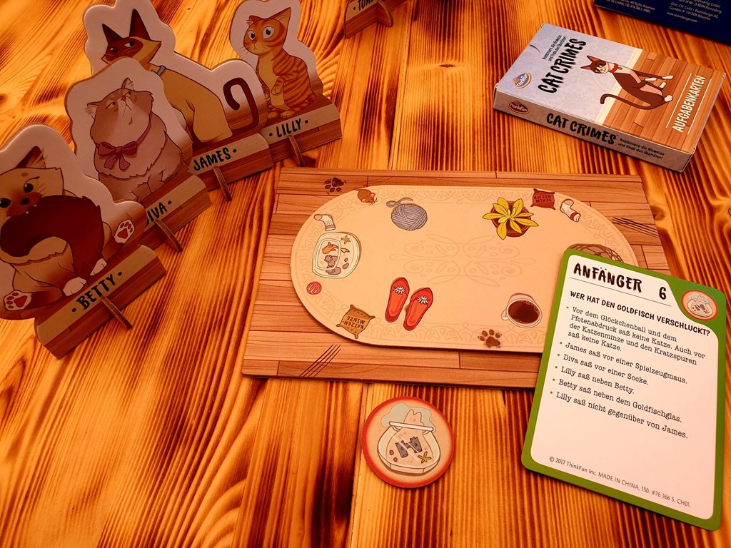 Die Aufgabenkarten werden nach und nach immer schwieriger. Auf der Expertenstufe sind sie durchaus eine große Herausforderung. Doch auch die Anfängerkarten lassen einen erstmal grübeln. Denn die Bezeichnung der verschiedenen Sitzpositionen sind nicht intuitiv. Gerade beim ersten Spiel musste ich immer wieder in der Anleitung nachschauen, was nun genau damit gemeint ist, dass die Katze Lilly „in der Nähe“ des Goldfischglases sitzt. Warum wurde hier nicht „vor dem Goldfischglas“ geschrieben? Denn nichts anderes ist damit gemeint. Und das verwirrt erstmal bzw. steigert die Schwierigkeit des Spiels an sich.