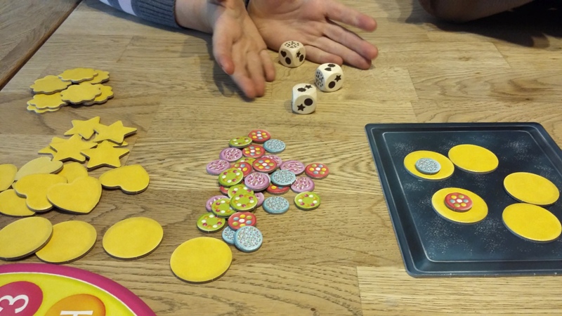 Das Kind, das an der Reihe ist, wirft alle drei Würfel und kann dann eine von drei möglichen Aktionen nutzen. Sofern Kekssymbole gewürfelt wurden, kann man sich für eine Keks-Art entscheiden und darf dann die gewürfelte Anzahl an Keksen – mit genau dieser Form – auf ein Backblech legen.