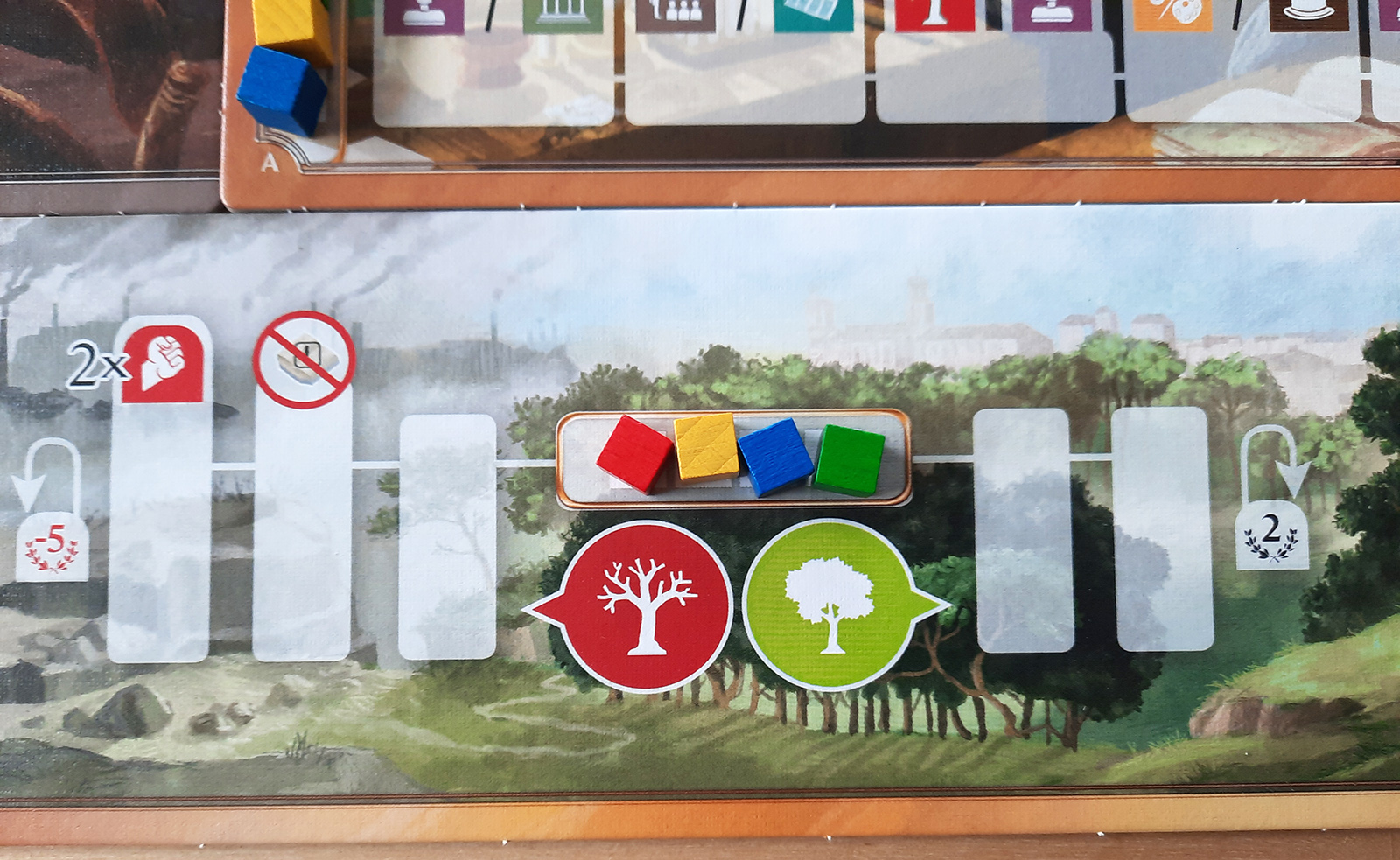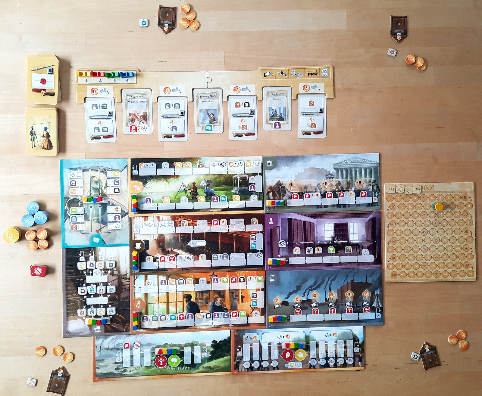 Das ist ein großartiger Spielmechanismus, der mich Runde für Runde vor knifflige Aufgaben stellt. Wunderbar gelöst. Was ebenso wunderbar ist, dass sich meine Markierungssteine auf den Leisten geradezu magisch immer weiter nach vorne schieben und bessere Aktionen auslösen. Ich spüre, wie mein Einfluss auf die Stadt immer besser wird. Ich erlebe im Spiel dieses Aufblühen der Stadt. Und ich freue mich über Kettenreaktionen, die mich auf drei oder vier Leisten nach vorne bringen mit nur einem minimalen Einsatz. Wunderbar.