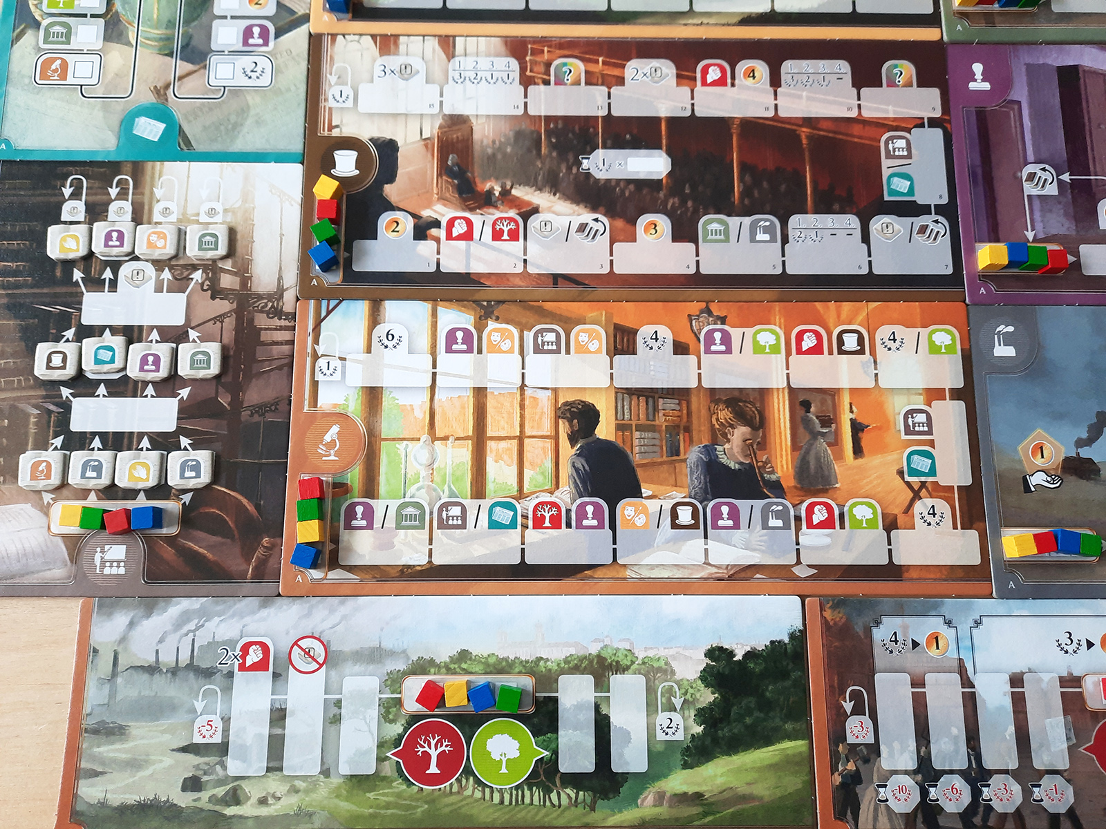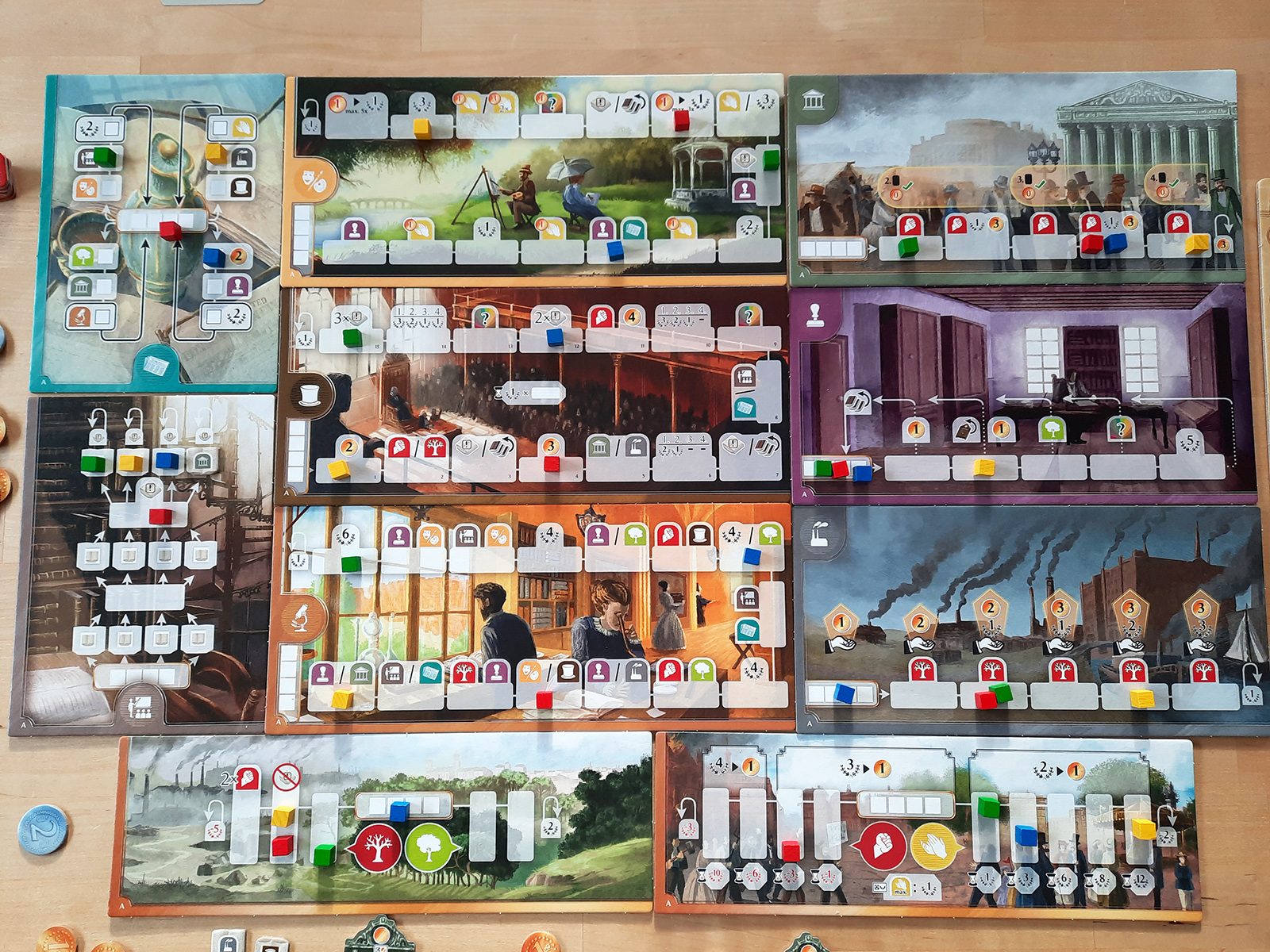 In „Rise“ sind wir Verantwortliche für die soziale und wirtschaftliche Entwicklung einer Stadt. Wir haben fast unbegrenzte Möglichkeiten, ob Kultur, Politik, Wissenschaft, überall können wir unsere Hebel ansetzen, und immer ein Auge auf die Natur und die Zufriedenheit der Bevölkerung werfen. Auf zehn – ja genau: zehn – verschiedenen Leisten rücken wir unsere Marker nach vorne und verbessern uns auf diesem Gebiet. UND! Und gleichzeitig verändern wir auch auf anderen Leisten unsere Werte. Denn irgendwie hängt jedes Feld mit einer oder mehreren Leisten zusammen.