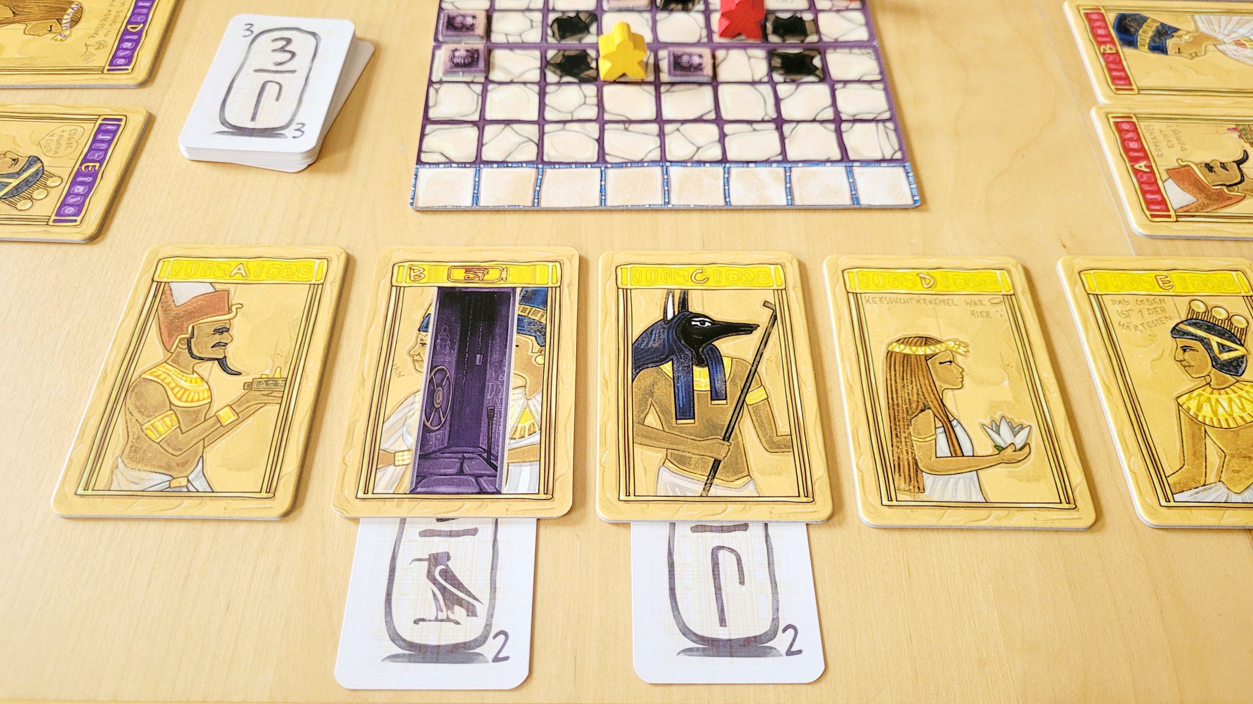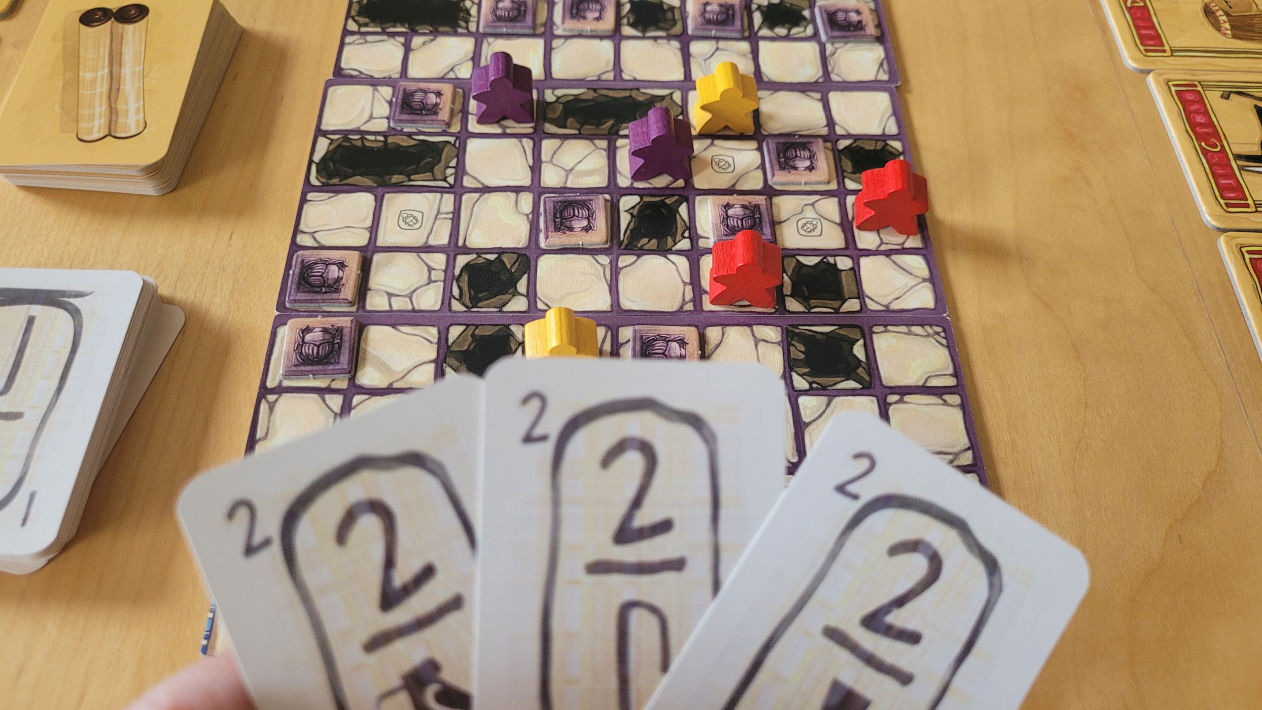Bin ich also an der Reihe, werfe ich eine meiner Handkarten ab und bewege einen meiner Forscher entsprechend um die Anzahl der Schritte, in Richtung Grabkammer. Danach ziehe ich wieder eine Handkarte nach.