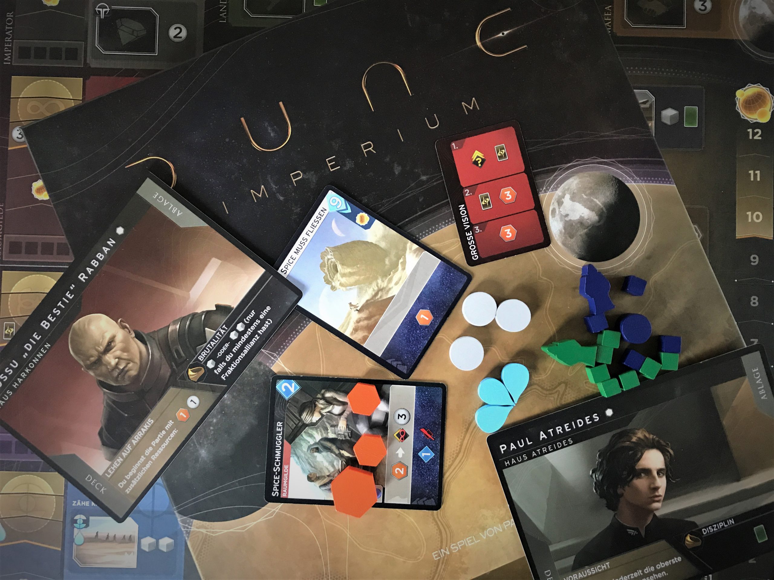 So entsteht eine spannende Dynamik in jedem Zug, ob ich eine Karte einsetze um einen Agenten zu platzieren oder aufhebe, um damit wertvollere Karten zu erhalten. Und natürlich will ich ja auch später im Konflikt noch ein bisschen mitmischen. Es verschmelzen der Worker-Placement-Mechanismus und der Deckbuilding-Mechanismus wie eine arrakische Symbiose aus Spice und Wüstensand.