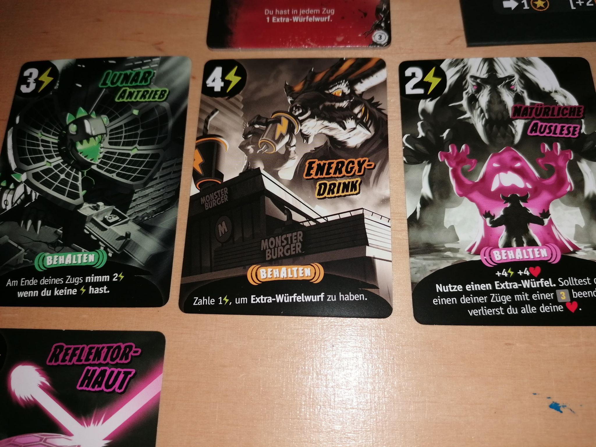 Vielleicht kauft man sich mit seiner Energie, die in Form von kleinen grünen Blitzen als Spielmaterial vorhanden sind, eine tolle Powerkarte. Auf ihnen gibt es auch ab und an Siegpunkte, aber vor allem haben sie einen coolen Effekt. Dieser wirkt sofort oder begleitet dich das komplette Spiel hindurch. Man darf aber auf keinen Fall vergessen sich zu heilen (Herz) oder Energie (Blitz) zu sammeln, denn mit der Energie kauft man sich ja schließlich seine Powerkarten, die einen im Kampf um Tokyo unterstützen. Man würfelt also und versucht natürlich den gegnerischen Monstern, durch das Würfeln von Tatzen soviel Schaden wie möglich zu verpassen, denn die Herzen sollen ja auf Null fallen. Hat man das geschafft, ist wenigstens schon ein Monster aus Tokio vertrieben und es scheidet aus.
