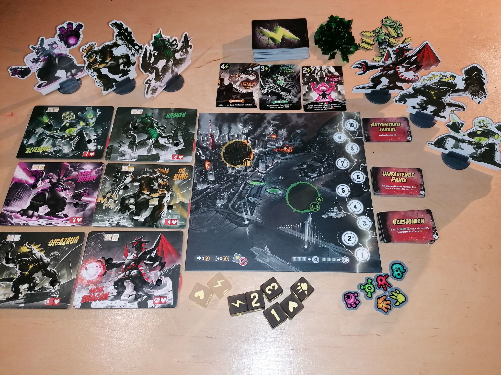 Das Spiel beginnt damit, dass jede*r Spieler*in sich eines der Monster aussucht und in einen der Aufsteller stellt. Die Monster sind in dieser Edition in grau-schwarz illustriert, aber jedes hat einen coolen Neonlook, in verschiedenen Farben. Man nimmt sich die dazu gehörige Monstertafel und stellt an dem Einstellrad die Siegpunkte auf 0 und die Lebenspunkte auf 10. Nun schlüpft man in die Rolle des Monsters und ist bereit für den Kampf um Tokyo. Ziel des Spieles ist es, entweder 20 Siegpunkte zu erreichen oder die Herzen aller anderen Monster auf 0 zu setzen.