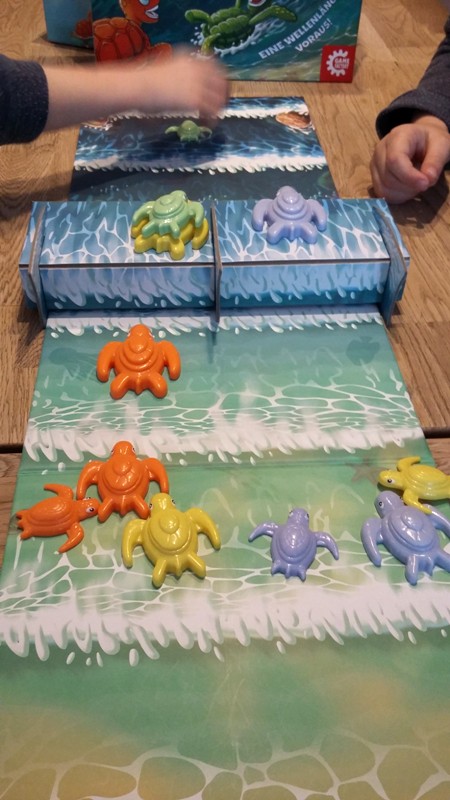Auch die Idee, auf Schildkröten springen zu können, um sich mit tragen zu lassen, oder andere zu überdecken, um sie am Ziehen zu hindern, gefällt uns sehr gut. Selbst Kinder ab 4 können diese Regeln mitunter schon gut verstehen und daher finden wir die Altersangabe ein wenig zu hoch angesetzt. Einziger Kritikpunkt ist ein gewisser Glücksfaktor. Durch das Bewegen der Welle kann es natürlich sein, dass jemand anderes gewinnt, obwohl man lange vorne lag. Und je nachdem wie oft die Welle gewürfelt wird, kann sich das Spiel auch mal in die Länge ziehen. Meist waren unsere Runden nach ca 20 Minuten beendet, es kamen aber auch längere Partien vor, da alle Schildkröten immer wieder an den Strand gespült wurden. Längere Runden ziehen sich für die Kinder dann zu sehr hin und lassen ihre Geduld schwinden.