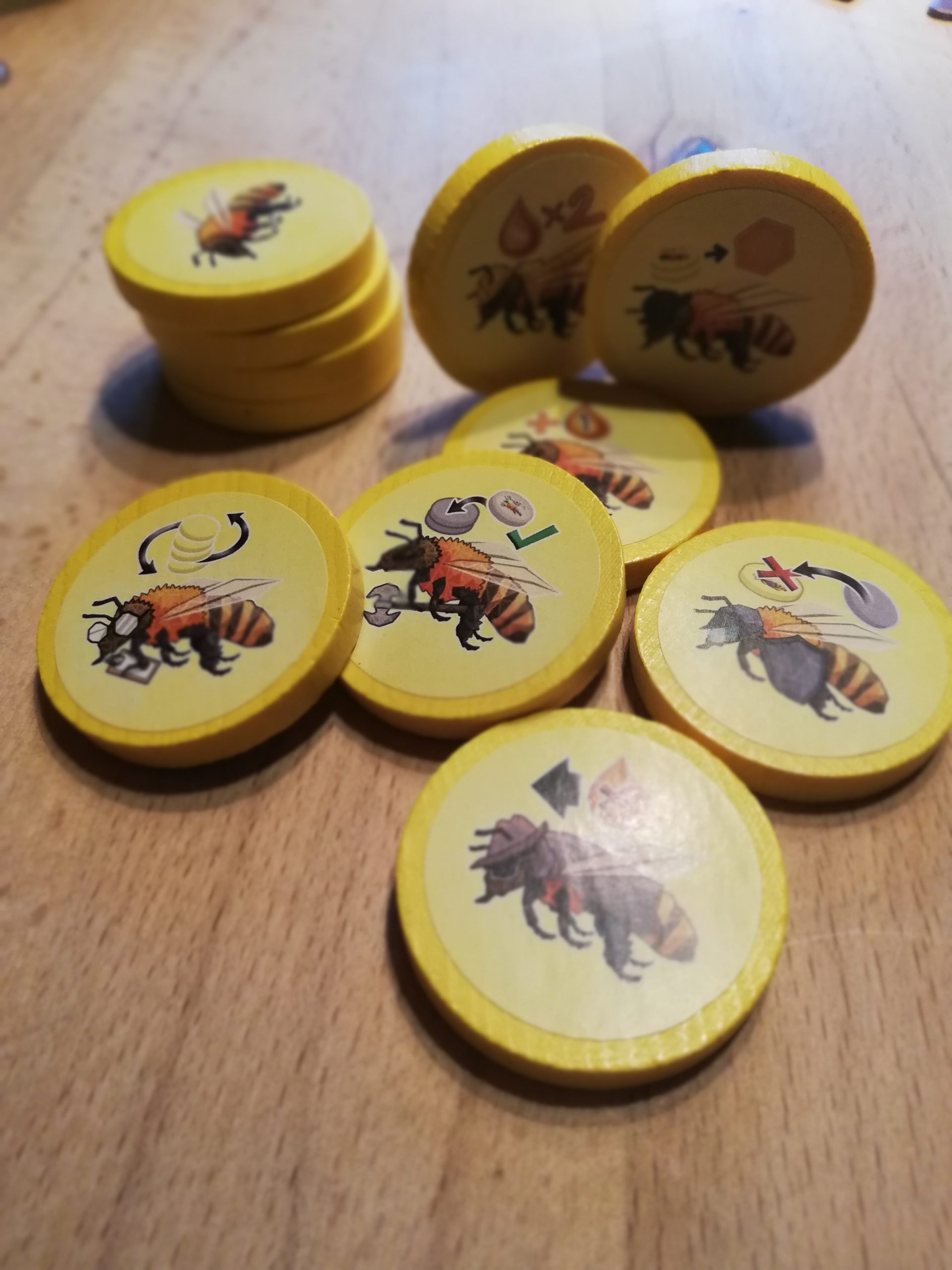 Zu Beginn hat jede*r Spieler*in einen Schwarm aus normalen Bienen und einer Sonderbiene. Nach jeder eigenen Wertungsrunde gibt man eine normale ab und erhält dafür eine weitere Biene, mit besonderer Fähigkeit. So gibt es Bienen, die besonders viel Nektar tragen können oder die sich auch auf Blüten setzen dürfen, die bereits von zwei fremden Bienen belegt sind oder Bienen, die extra schnell vorankommen, um nur einige der Superkräfte zu nennen.