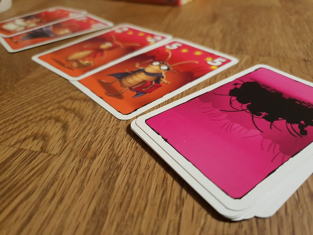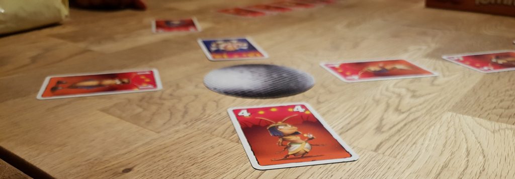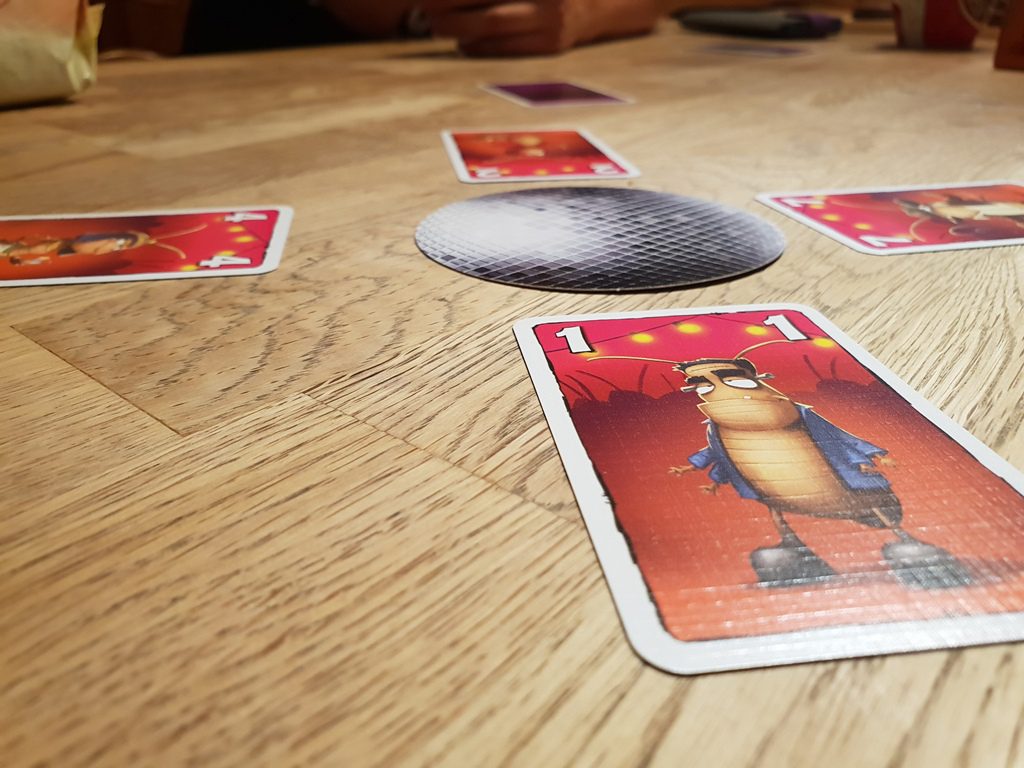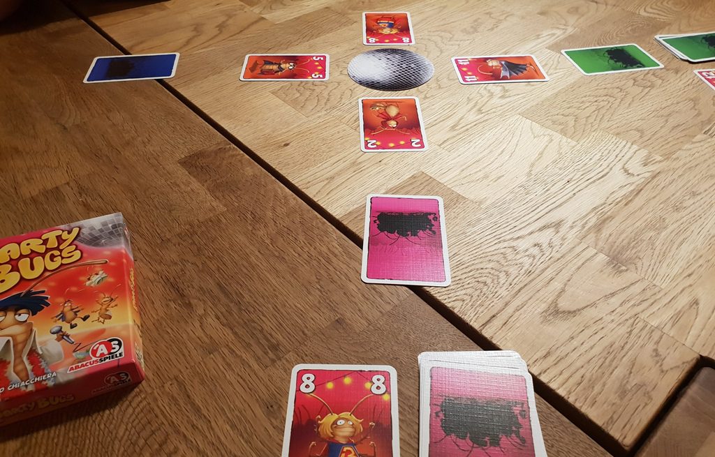 Party Bugs ist ein schnelles und lustiges Kartenspiel – ideal als Absacker, zum Aufwärmen und zwischendurch. Besonders sticht natürlich die witzige Grafik hervor, die dem Spiel so richtig Würze verleiht. Man legt nicht nur stupide Karten ab, sondern tanzt um die Discokugel mit seinen verkleideten Kakerlaken. Das macht wirklich Spaß. Natürlich ist auch die Mechanik interessant, denn nur so fühlt es sich auch wie ein Kakerlaken-Tanz an. Man muss eine Karte wählen, diese verdeckt vor sich auslegen und schließlich zusammen aufdecken. Wenn dann jeder eine Karte aus der Mitte gewählt hat und vor sich ablegt, tanzt die vorher aufgedeckte Karte auch schon an die Diskokugel. Und so ist es ein hin und her der Karten, ein Tanz eben, der nur eines zum Ziel hat: Am Ende des Spiels möglichst wenig Punkte zu besitzen.