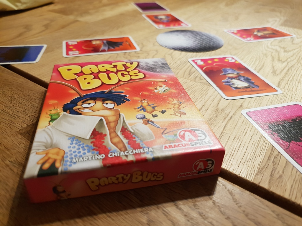 Party Bugs ist ein schnelles und lustiges Kartenspiel – ideal als Absacker, zum Aufwärmen und zwischendurch. Besonders sticht natürlich die witzige Grafik hervor, die dem Spiel so richtig Würze verleiht. Man legt nicht nur stupide Karten ab, sondern tanzt um die Discokugel mit seinen verkleideten Kakerlaken. Das macht wirklich Spaß. Natürlich ist auch die Mechanik interessant, denn nur so fühlt es sich auch wie ein Kakerlaken-Tanz an. Man muss eine Karte wählen, diese verdeckt vor sich auslegen und schließlich zusammen aufdecken. Wenn dann jeder eine Karte aus der Mitte gewählt hat und vor sich ablegt, tanzt die vorher aufgedeckte Karte auch schon an die Diskokugel. Und so ist es ein hin und her der Karten, ein Tanz eben, der nur eines zum Ziel hat: Am Ende des Spiels möglichst wenig Punkte zu besitzen.