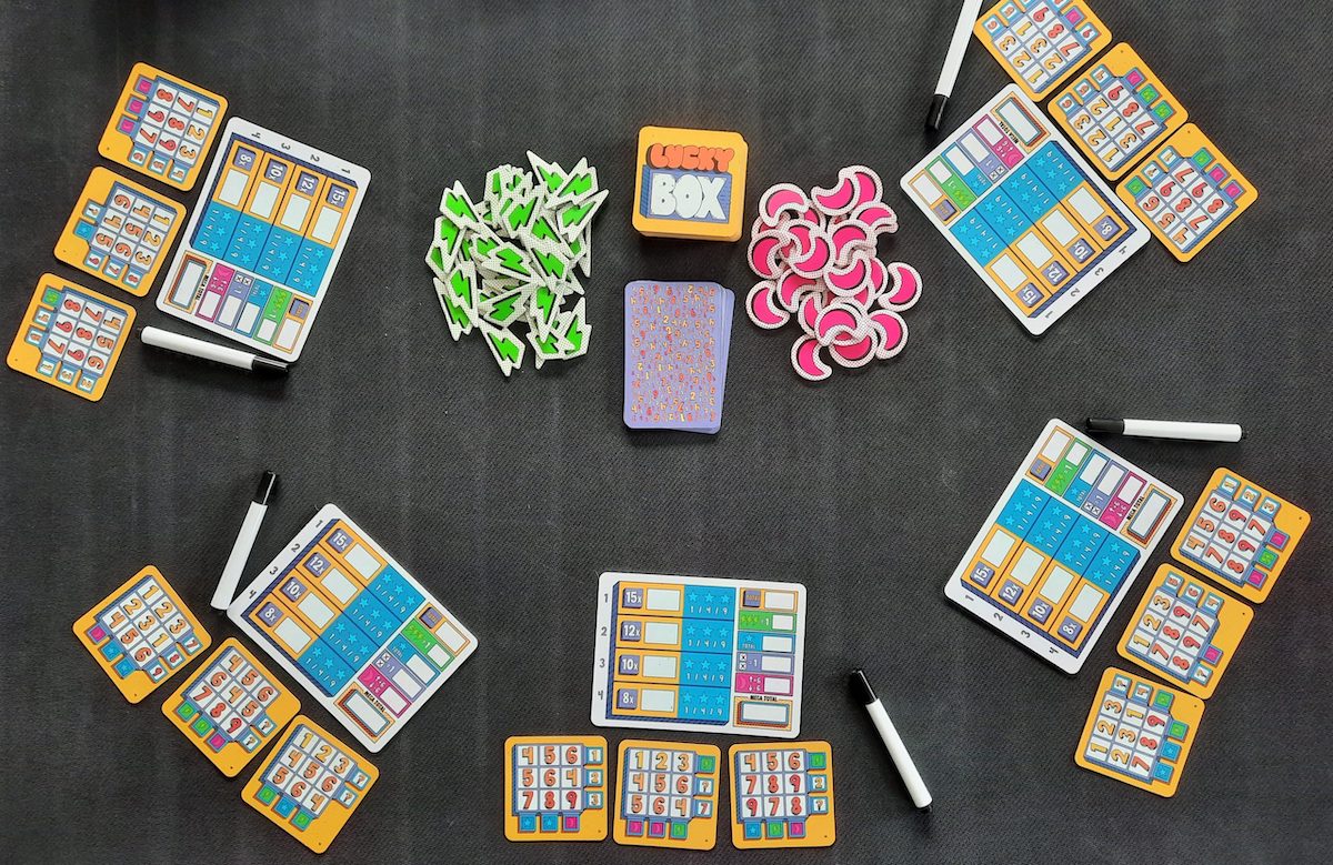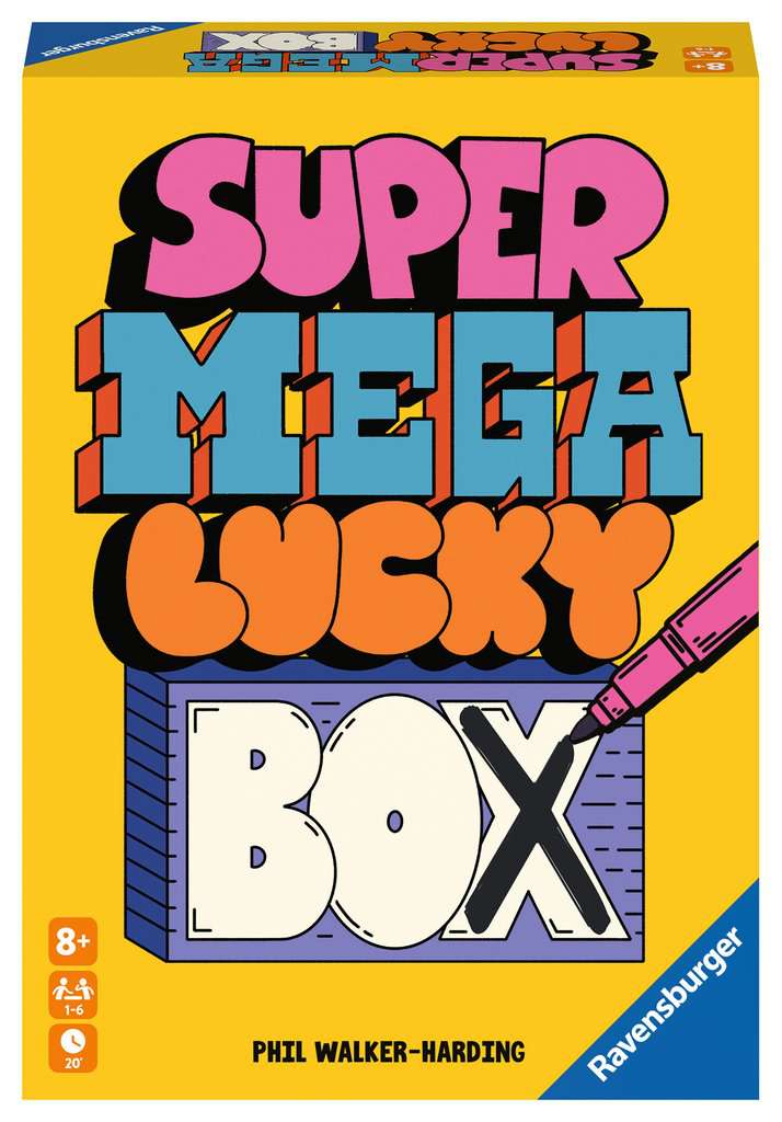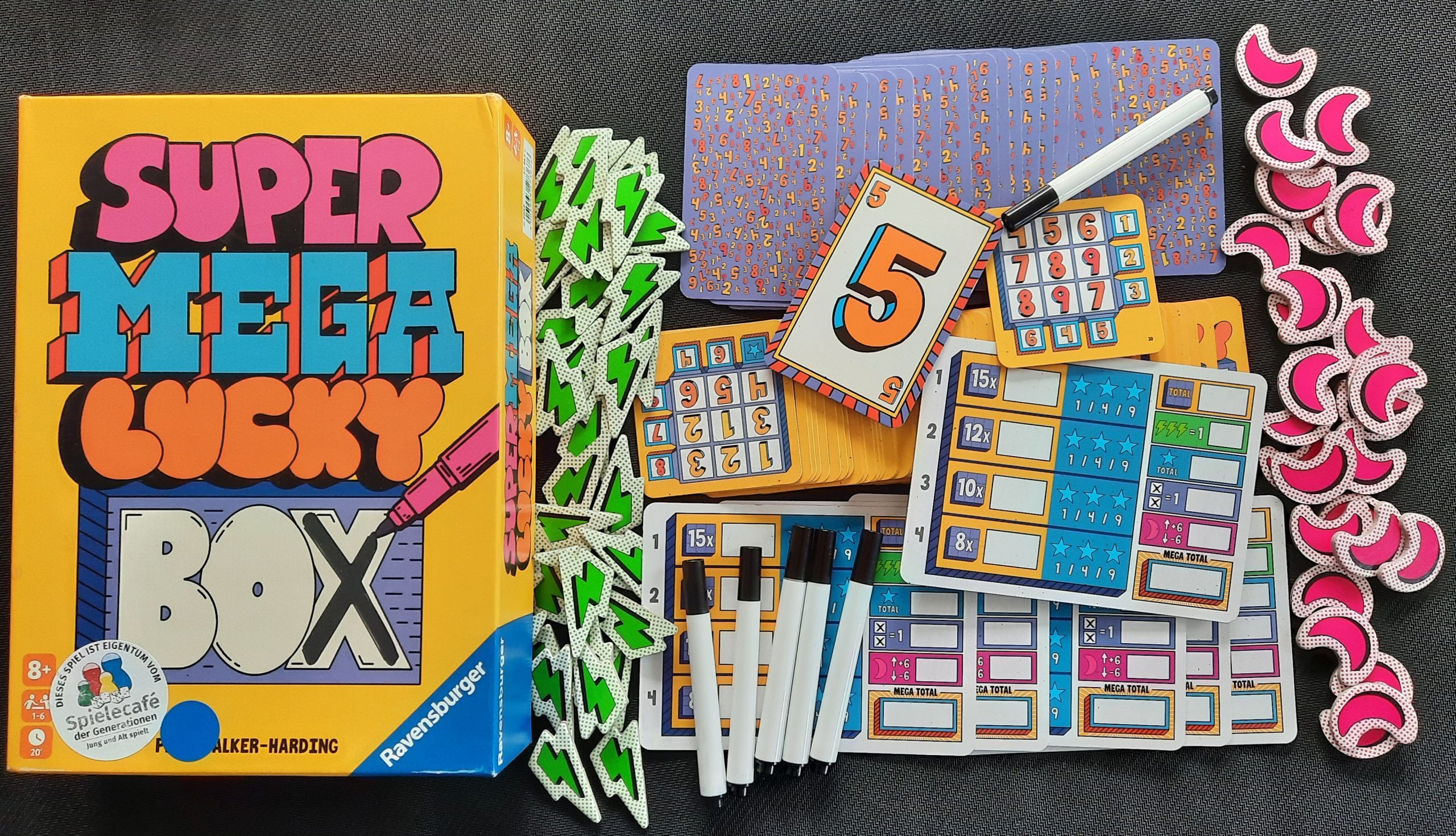 Die Super Mega Lucky Box ist eine Fortführung des Spiels Bingo. Alle Spielenden erhalten abwischbare Kärtchen, auf denen in unterschiedlicher Anordnung Zahlen zwischen 1 und 9 abgebildet sind. Aufgerufen werden die Zahlen durch das Aufdecken von Karten. Das Vervollständigen von Reihen oder Spalten auf den eigenen Kärtchen bringt Boni, das kann das Ankreuzen weiterer Zahlen sein, punktebringender Sternchen für das eigene Tableau oder das Erhalten von Blitz- oder Mondplättchen.