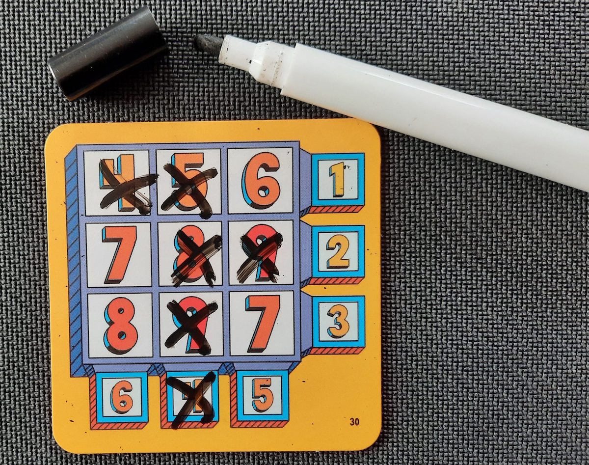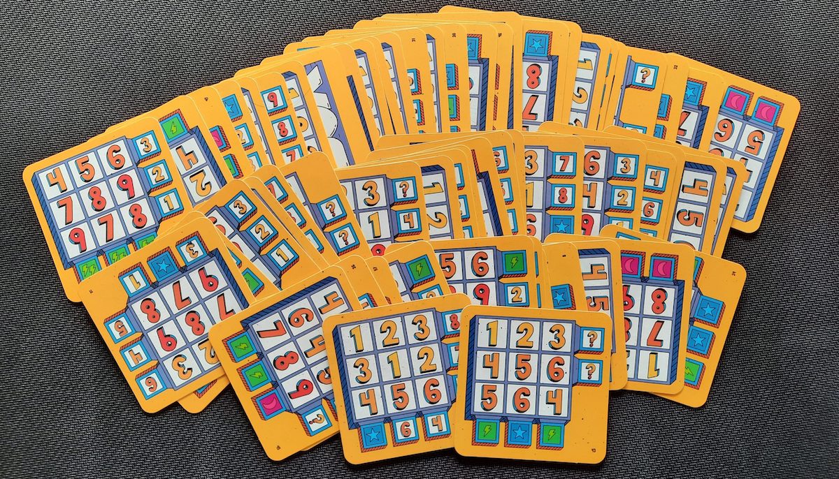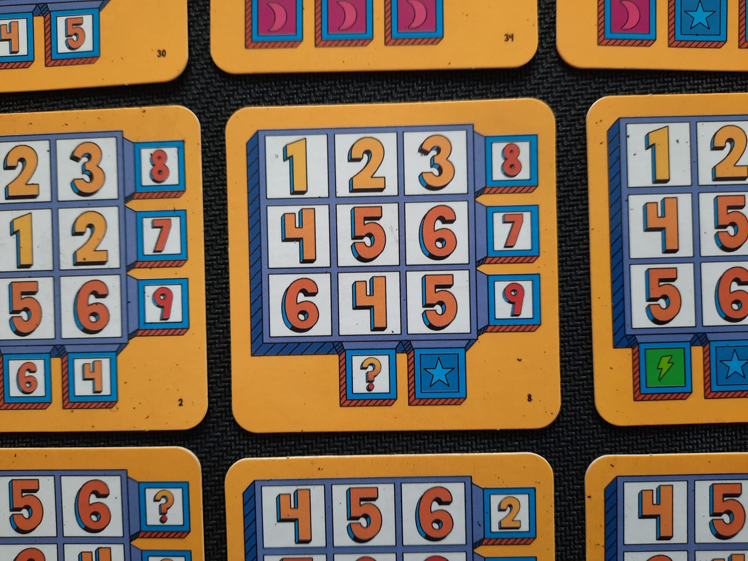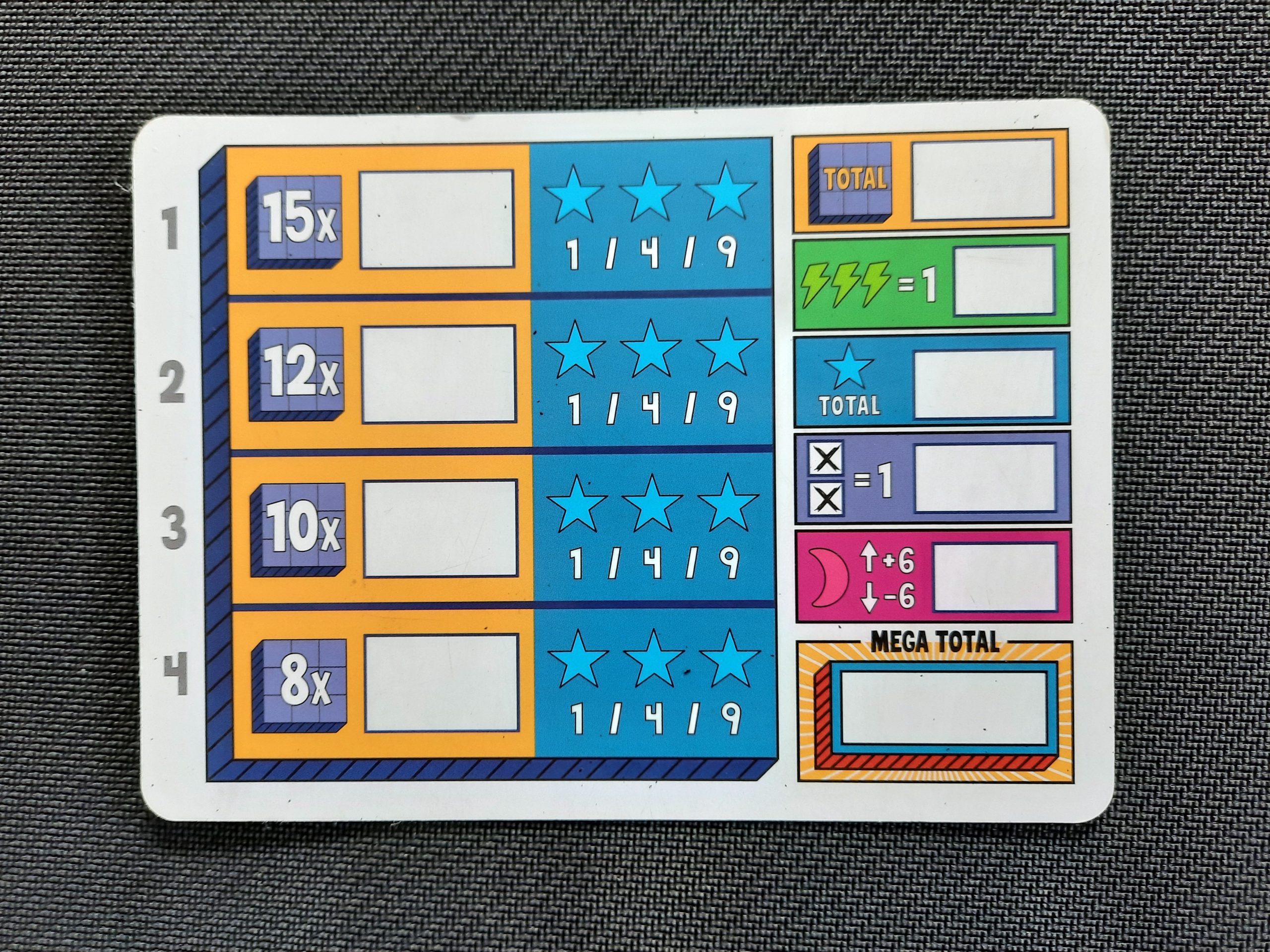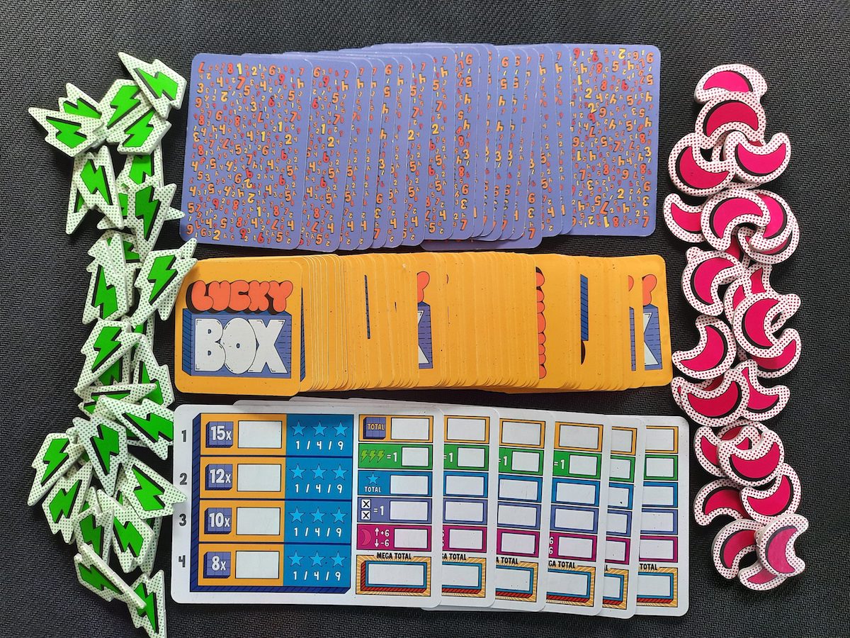 Karten und Wertungstafeln sind von ausgezeichneter Qualität und Eintragungen lassen sich problemlos abwischen. Die Mond- und Blitzmarker sind stabil, gut zu greifen und von angenehmer Größe. Die Ziffern auf den Zahlenkarten und auf den Lucky-Box-Karten (für die einzelnen Spielenden) sind klar dargestellt. Farbe wird unterstützend genutzt.