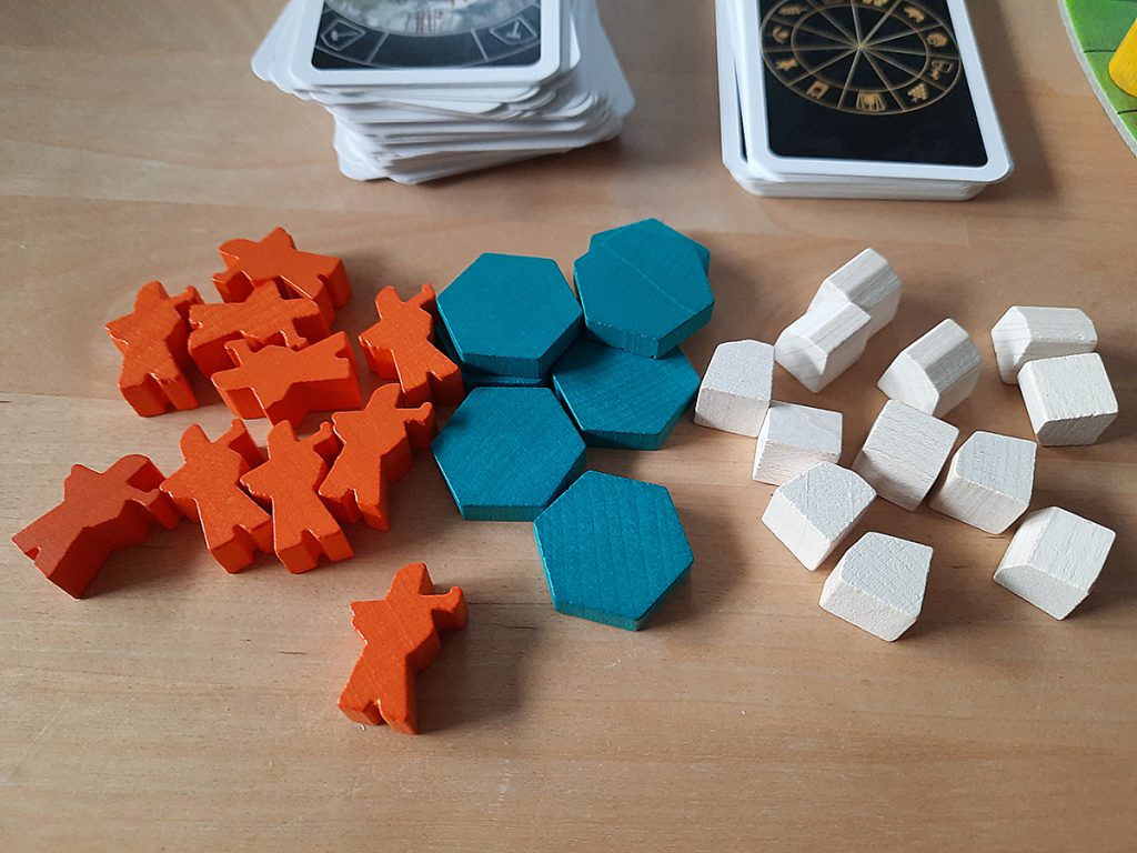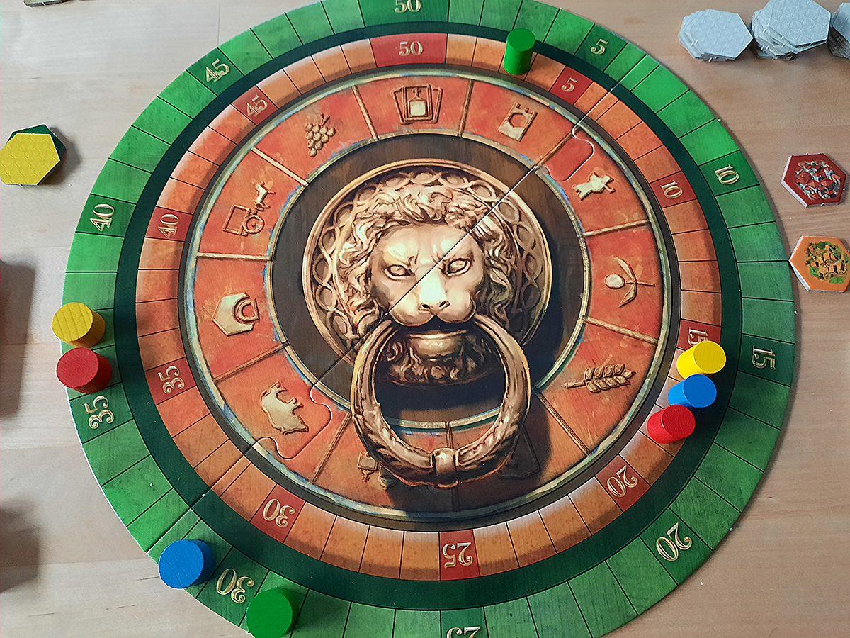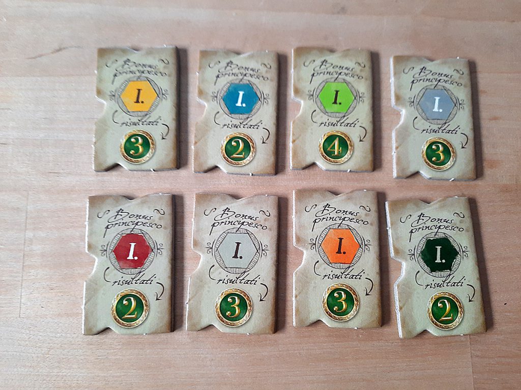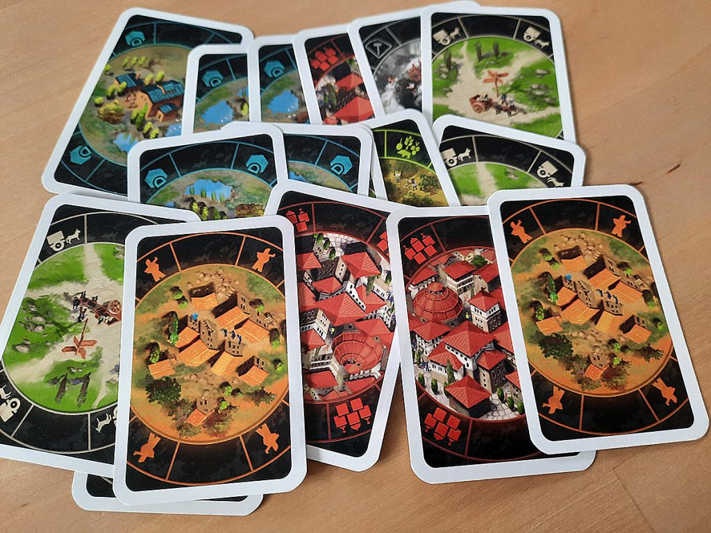 Da man zu Spielbeginn drei Landschaftsteile mit je 10 Feldern erhält und diese vor Spielbeginn als seine eigenen „Toskana“-Landschaft auslegt, kann man hier schon versuchen, die lukrativen 3er-Felder zusammenzulegen. Was zufällig dem einen besser, dem anderen schlechter gelingt.