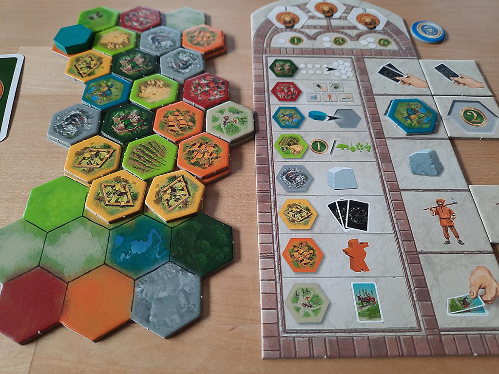 Der zweite Kritikpunkt ist der Spannungsbogen. Zwar bleibt das Spiel in den meisten Fällen bis zuletzt offen, aber es entwickelt sich wenig im Spiel. So ist der erste Zug ähnlich dem letzten, man sammelt Karten, reserviert Plättchen und legt schließlich mit Hilfe gleicher Karten Plättchen auf die Landschaften und führt Aktionen aus. Der Wettlauf um die Farbboni und der Ausbau der eigenen Möglichkeiten mit Hilfe der Bonuskärtchen ist im Vergleich zum Spielablauf zu wenig. Es passiert zu wenig und das Spiel zieht sich etwas dahin.