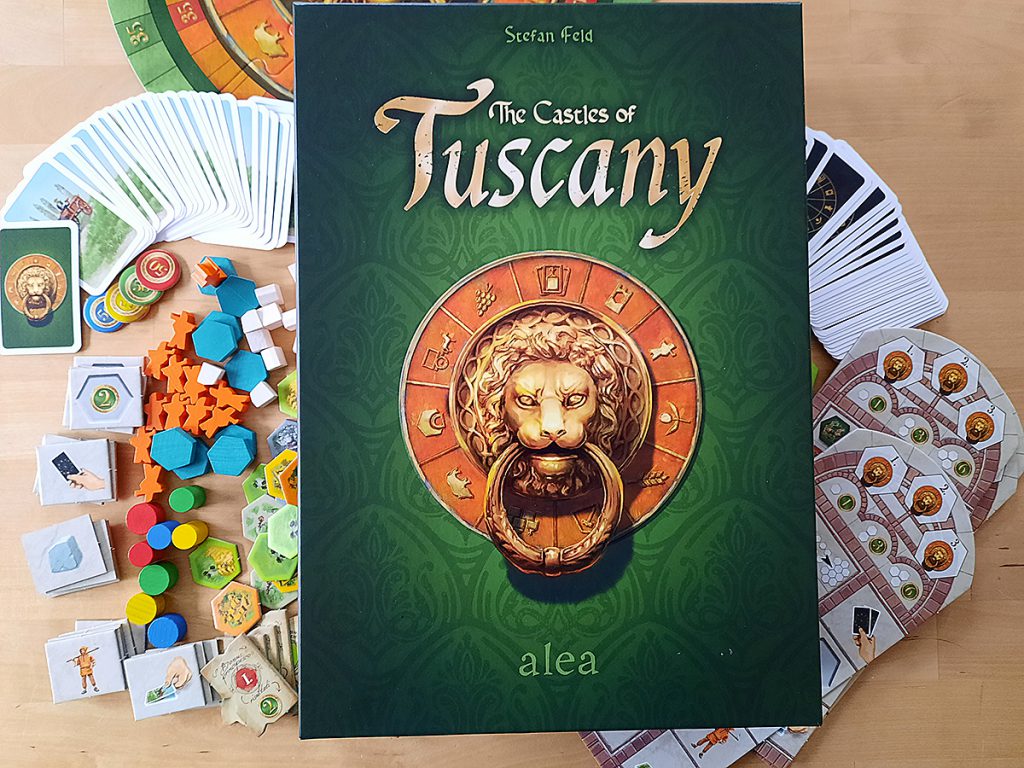 The Castles of Tuscany | Stephan Feld | 2-4 Spieler:innen | ab 10 Jahren | alea, Ravensburger | Ein bis zuletzt spannendes Kartensammel-Plättchenlegespiel für spielerfahrene Gelegenheitsspieler:innen und Familien.