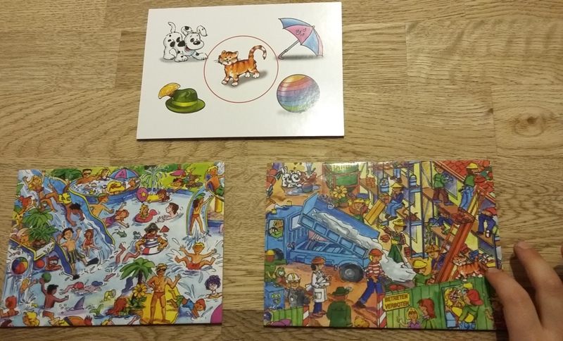 Im Spiel sind 20 verschiedene Bilderkarten vorhanden. Auf der Vorderseite sind im Wimmelbild-Stil verschiedene bunte Szenarien abgebildet, wie z.B. ein Ausschnitt aus dem Schwimmbad. Auf jeder Karte sind zudem fünf verschiedene Gegenstände versteckt. Diese sind jeweils auf der Rückseite abgebildet.