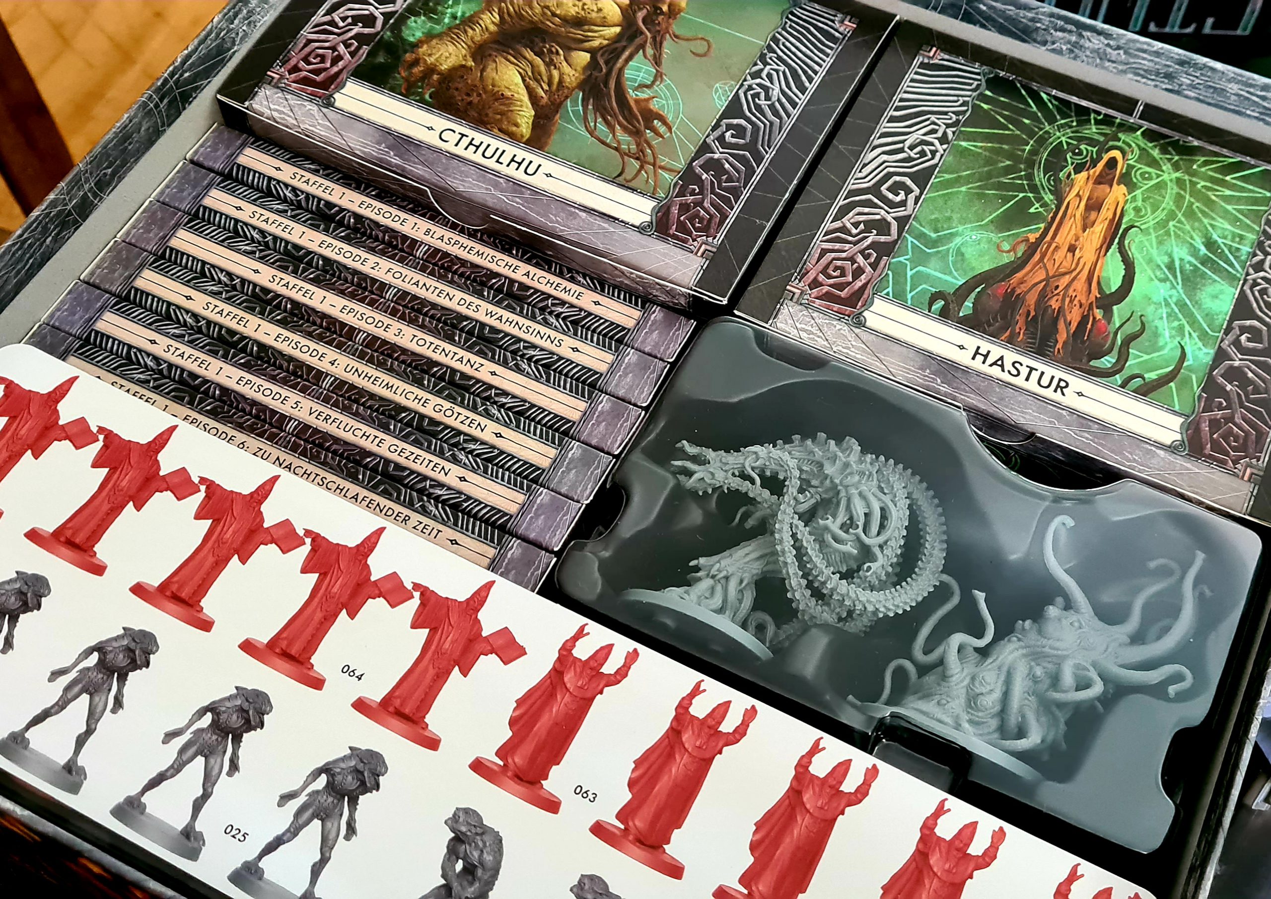 Groß, schwer und reichhaltig befüllt. So kann wohl die Spielschachtel von Cthulhu Death May die beschrieben werden. Bereits das Auspacken des Materials bereitete große Freude: Nicht nur wundervoll gestaltete Miniaturen und ansprechendes Zubehör warteten auf mich, alles war auch noch so genial verpackt. Schön sortiert und geordnet in verschiedensten Schachteln. So gefällt mir das.