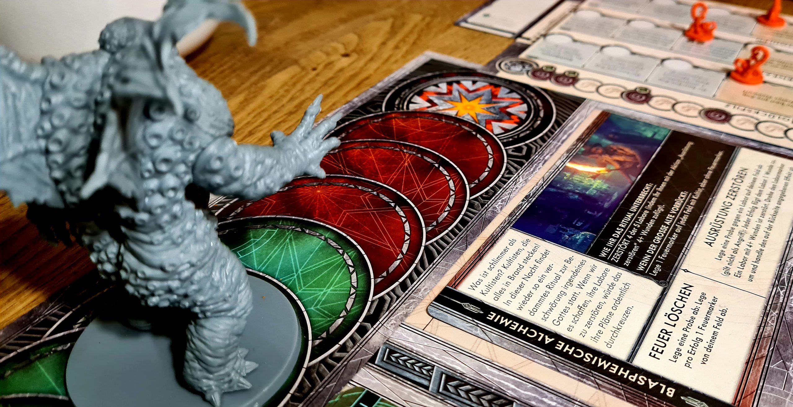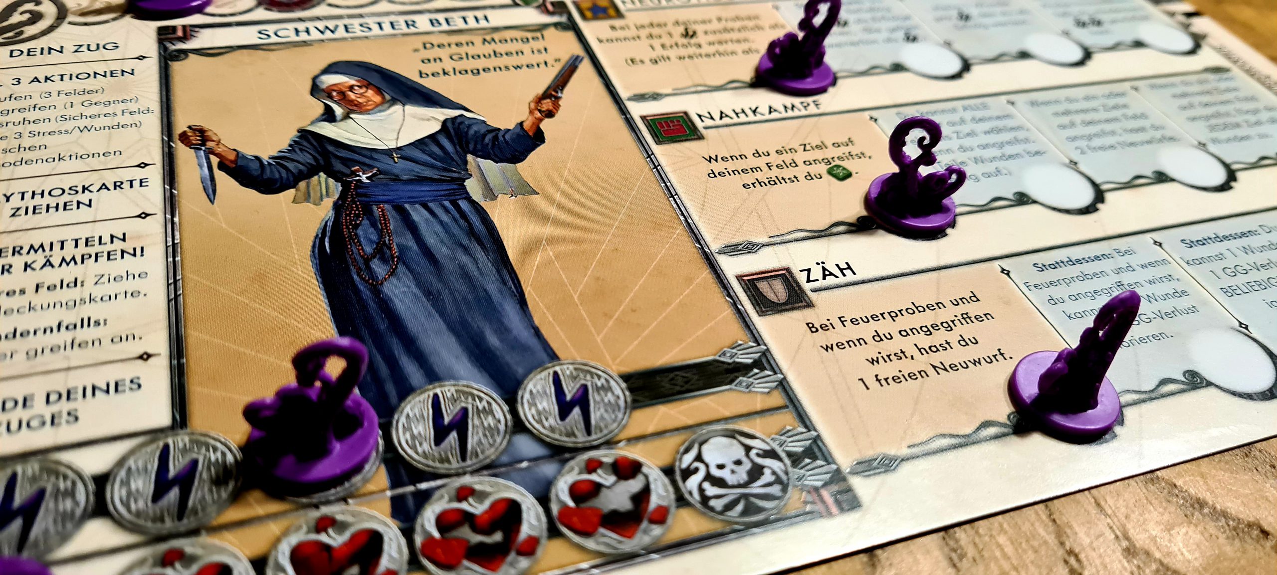 Ins Spiel rein finden dauert normalerweise. Mechanismen wollen kennengelernt und Spielabläufe verinnerlicht werden. Doch Cthulhu Death May ist tatsächlich so logisch aufgebaut, dass wir sofort im Spiel waren. Für eine gute Übersicht sind die Abläufe jeder Runde auf den Spielerboards abgebildet. Natürlich haben wir dennoch ab und zu mal in den Regeln nachschlagen müssen. Denn wie war das nochmal mit dem Feuer?