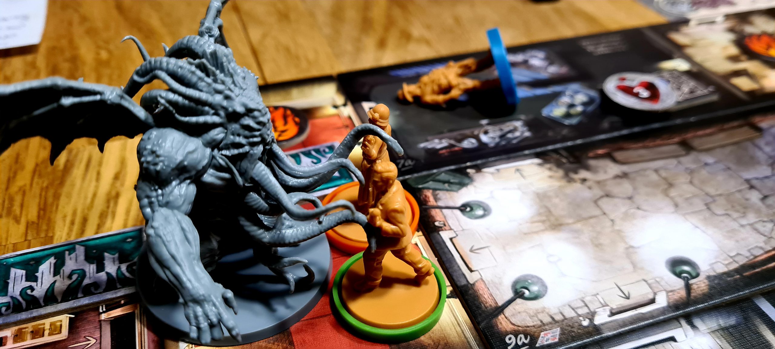 Wir waren sicher, das Spiel ist verloren. Doch wir hatten noch einen Joker in der Tasche. Wir bekämpften gerade Stufe vier. Zwei Charaktere hatten sich bereits geopfert und waren auf der Strecke geblieben. Dann schmiss eine Spielerin eine Bonuswaffe in Petto und konnte damit erheblichen Schaden anrichten. Es reichte ein einziger Angriff und Cuthlhu war besiegt. Im letzten Spielzug. Denn am Ende dieses Spielzuges hätten wir verloren.