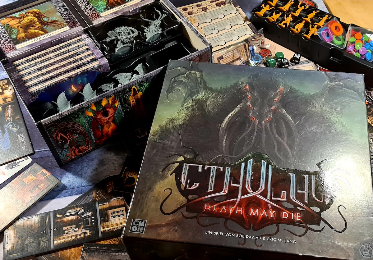 Bereits nach Tag 1 war klar. Ein Spiel, das über mehrere Episoden verläuft und das auch noch so reichhaltig an Varianz ist – lässt sich nicht mit einer Rezension erfassen. Also lasse ich Euch diesmal an den verschiedenen Spielerunden teilhaben. Denn jede Runde bietet unterschiedliche Herausforderungen und somit immer wieder ein neues Spielgefühl. Doch Vorsicht. Cthulhu Death May Die ist nichts für schwache Gemüter. Denn es spielt im Cthulhu-Universum, einem Horror-Setting, in dem die großen Alten die Welt vernichten und die Menschen den Verstand verlieren…