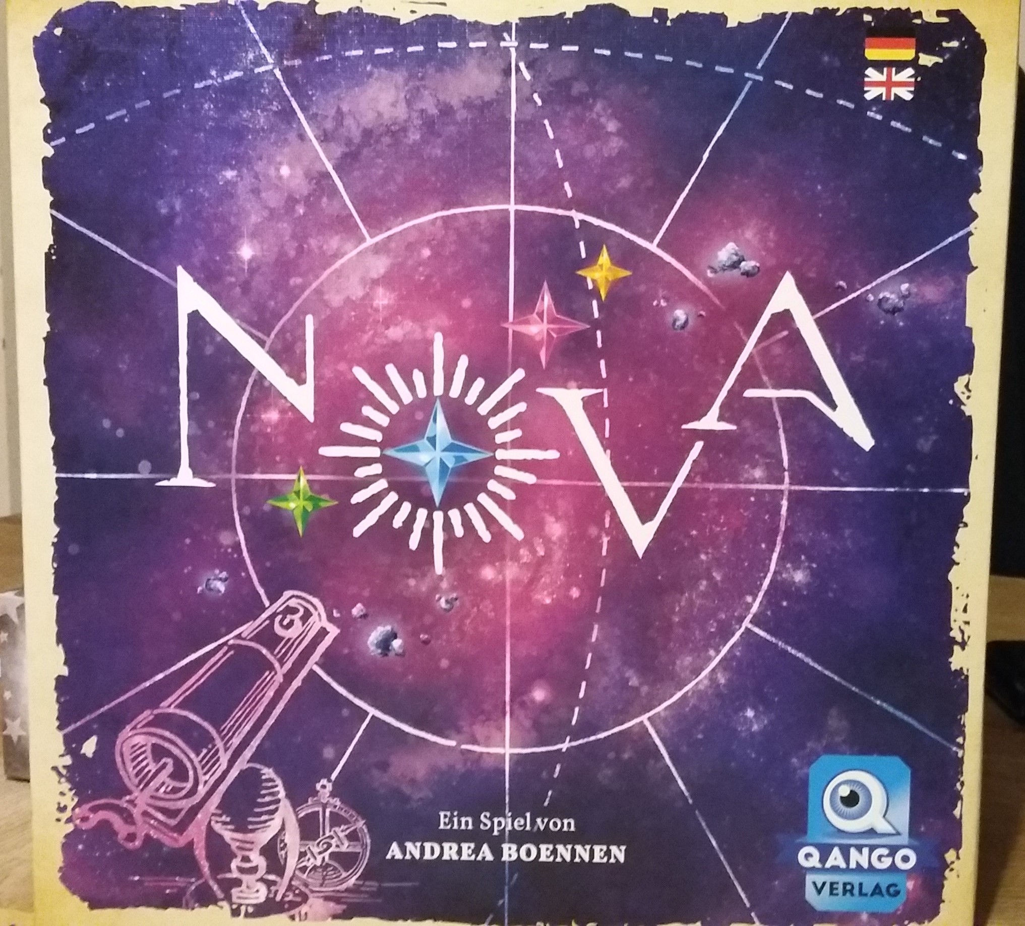 Nova von Andrea Boennen ist eine beim Qango Verlag erschiene Neuheit des Jahres 2017. Das Spiel ist ab 8 Jahren geeignet und lässt sich mit 2-4 Spielern spielen. Bei Nova handelt es sich um ein Legespiel, bei dem man die zuerst wenig gefüllte Sternenkarte wieder mit Sternenbildern erstrahlen lässt. Dies geschieht, in dem abwechselnd Sternenplättchen ausgelegt werden, die bereits ausliegende Plättchen berühren müssen.