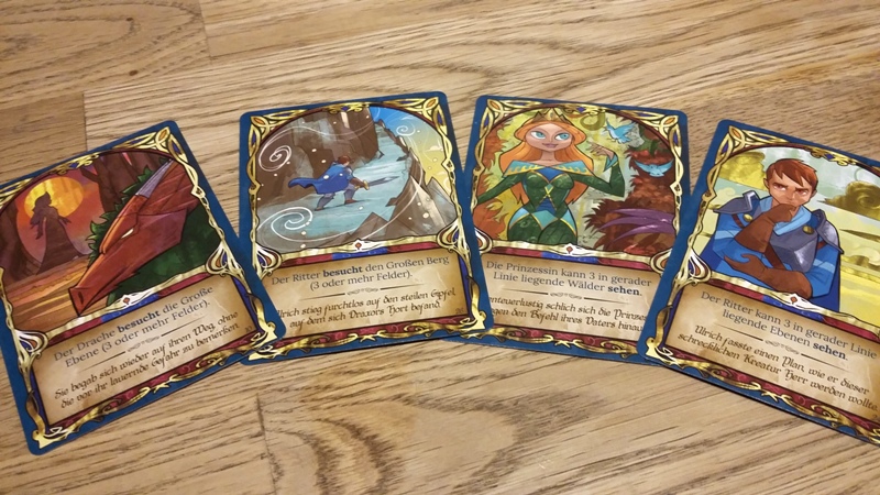 Wird als alternative Aktion ein neues Gebiet angelegt, nimmt man sich das oberste Plättchen und legt es so an, dass es mindestens an 2 Seiten ein anderes Gebiet berührt. Außerdem müssen Flussteile passend gelegt werden. Als Gebiete sind Wald, Ebene, Berg und Schloss vorhanden. Diese Gebiete sind auch auf der jeweiligen Buchseite/Aufgabenkarte relevant. So besagt eine Aufgabe z.B., dass Prinz und Drache sich auf dem Berg treffen müssen, oder die Prinzessin den großen Fluss (mindestens 5 Orte mit Flussteil drauf) besuchen muss.