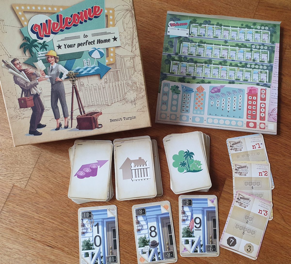 In diesem flip-and-write-Spiel haben wir drei Straßenzüge, deren Grundstücke mit aufsteigenden Hausnummer versehen werden sollen. Dazu gilt es, Gärten anzulegen, Swimmingpools zu bauen und vor allem Zäune zu errichten um Bereiche werten zu können. In jeder Partie sind drei Aufgaben ausgelost, die es schnell zu erfüllen gilt. Doch bei aller Vielfalt ist Welcome to gemütlich und entspannt zu spielen.