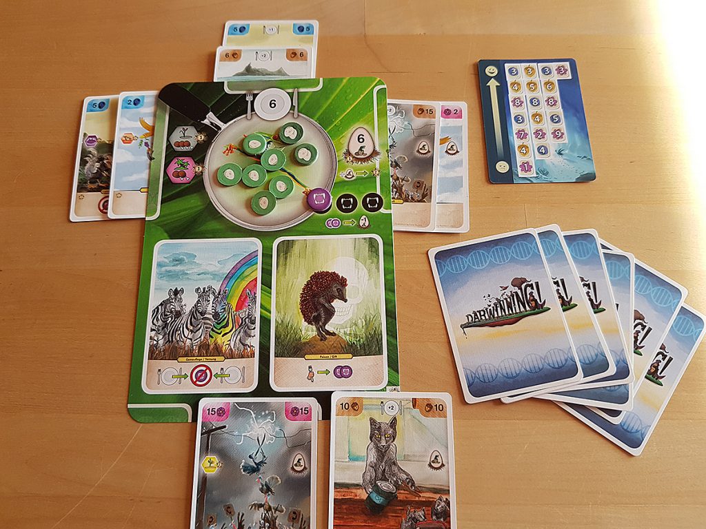 „Darwinning“ ist ein Stichspiel. Dabei geht es aber weit mehr als nur um Kartenspielen. Hier müssen wir uns um eine zufällig erhaltene Spezies kümmern. Diese will wachsen, tut das aber nur, wenn genug Nahrung vorhanden ist. Also müssen wir unsere Spezies im Lauf des Spiels an unterschiedliche Umgebungen anpassen. Außerdem müssen wir verhindern, dass sie durch Tiere, die höher in der Nahrungskette stehen, gefressen und ständig dezimiert werden. Aber die Nahrung von unterlegenen Tieren zu holen und deren Populationen klein zu halten ist genauso wichtig. Am Ende, nach drei Runden, zählen die Punkte, und die setzen sich aus der Größe der Population und der Stufe auf der Nahrungskette zusammen. Da startet man zwar sehr unterschiedlich, eine Spezies z. B. auf der 3, eine andere auf der 10, aber das Spiel gleicht das schön aus.