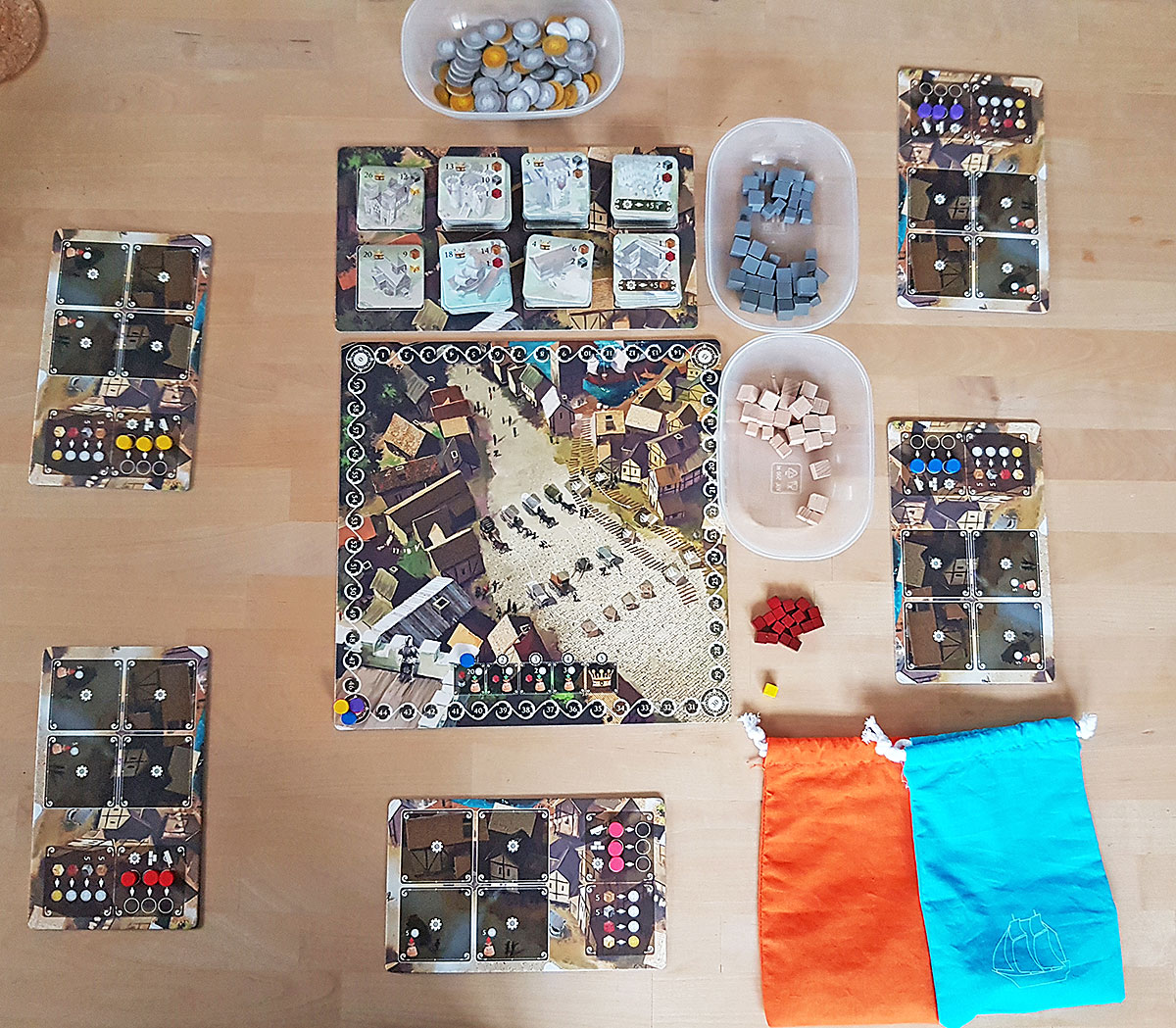 Bis jetzt klingt es nach einem wirklich tollen Spiel. Ist es aber nicht! Leider. Denn der Autor hat übersehen, den deutlichen Nachteil des Startspielers zu berücksichtigen. Generell gilt, wer in der Runde weiter hinten an die Reihe kommt, hat deutlich mehr Vorteile. Warum das? Weil nur der aktive Spieler bauen darf. So hat der Spieler, der weiter hinten sitzt, mehr Möglichkeiten, bevor er dran ist Rohstoffe zu sammeln und kann in seiner ersten Bauphase vielleicht bereits ein Gebäude oder gar mehrere bauen, während die Spieler vor ihm in den Auktionen überboten wurden und keine Ware haben. Und früh Produktionsgebäude zu haben ist sehr wichtig. Dieser Vorteil wirkt nicht nur in der ersten Runde, auch in der letzten. Denn bis zuletzt kann der letzte Spieler um Rohstoffe bieten und hat dann noch die Möglichkeit zu bauen. Das ist so ein großer Vorteil, dass es kaum aufzuholen ist. Schade.