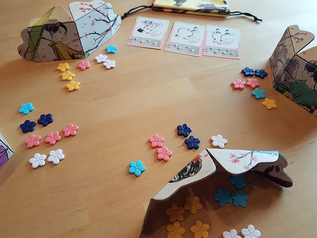 Am Ende gibt es Punkte für die vor dem Schirm offen liegenden Blüten. Da kann jeder abschätzen, wie er punktemäßig steht. Aber die Blüten hinter dem Schirm, die geheimen, bringen dicke Punkte und werfen oft das Ergebnis komplett um. Man sollte nicht zu früh aufgeben in diesem Spiel und bis zuletzt sein Glück versuchen.