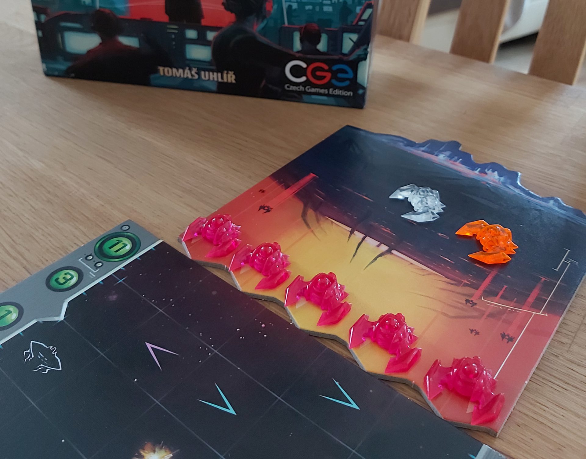 Wenn ich einen 6er Würfel in einem Energieraum platziere, ist das natürlich super, weil ich damit 6 Stromeinheiten gewinne, allerdings bewegen sich dann alle feindlichen Schiffe in dieser Spalte 6 Felder auf unsere Basis zu, das ist also weniger super. Jedes der feindliche Schiffe, das so meine Basis erreicht, fügt mir einen Schaden zu. Hier muss man extrem gut taktieren und abschätzen, wo die feindlichen Schiffe landen. Es gibt Felder, auf denen sie dafür sorgen, dass das Mutterschiff sich (zusätzlich zur Bewegung am Ende der Runde) schon um eine Zeile absenkt. Andere Felder bringen die Schiffe auf unseren Radar und ermöglichen es, sie gezielt abzuschießen.