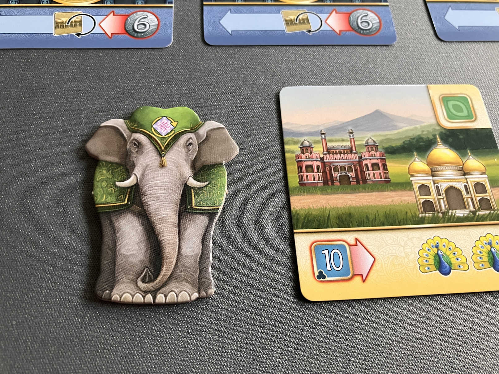 Eine Person eröffnet die Runde und hat den „Startofant“ – ein heiliger Elefant. Am Zug habe ich die Auswahl: Ich nehme eine Karte auf die Hand und nutze ihre Rückseite als Würfel, die entstehende Lücke bleibt bis Rundenende offen. Oder ich kaufe eine Karte aus dem Markt für ihren Preis in Würfelaugen und ggf. auch in der passenden Würfelfarbe. Eine gekaufte Karte löst einen Effekt aus und liegt fortan offen in meiner Auslage. Dort beginnt jede Person für sich zu sammeln, z.B.: Gebäude, Handelswaren oder Schiffe. Für jede Sorte gelten unterschiedliche Spielregeln. Für alle 3 ist gleich: Habe ich zu irgendeinem Zeitpunkt 3 gleiche Symbole oder alle 3 verschiedenen Symbole eines Sets, so muss ich diese umwandeln. Entweder in einen Gehilfen oder in Geld entsprechend des Warenwertes.