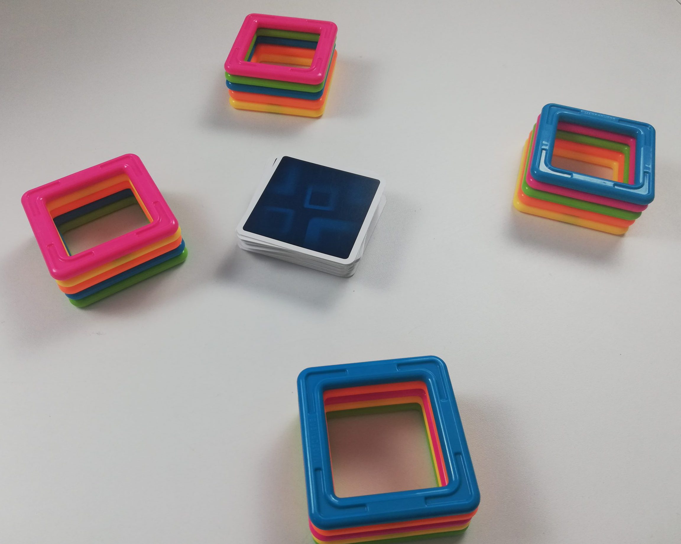 Alle erhalten fünf verschiedenfarbige Quadrate, die Aufgabenkarten kommen für alle sichtbar in die Tischmitte.