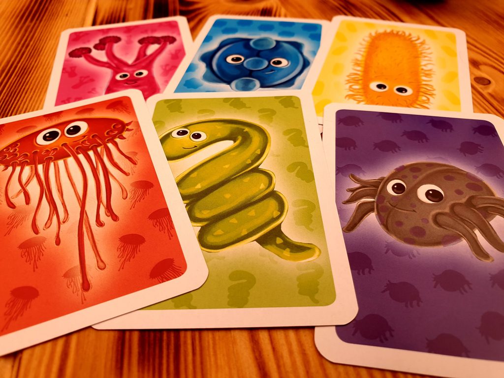 Was mich und auch meine Kinder sofort angesprochen hat, ist die Grafik. Die verschiedenen Bakterien sind allerliebst gestaltet – nicht nur auf den Karten, sondern auch auf der Spielschachtel. Dazu begeistert eine tolle Spielanleitung, die den Bakterien Namen gibt sowie stabiles Material.