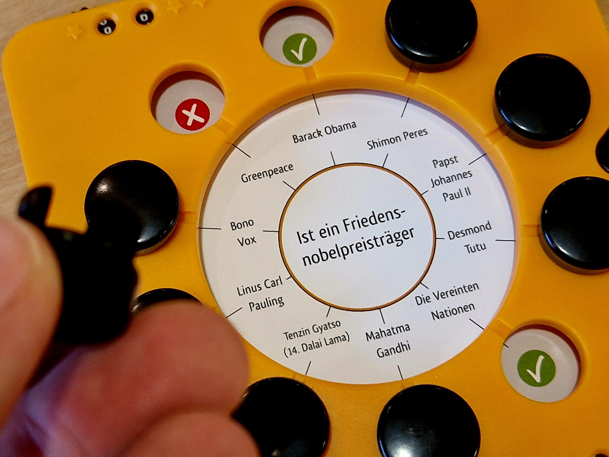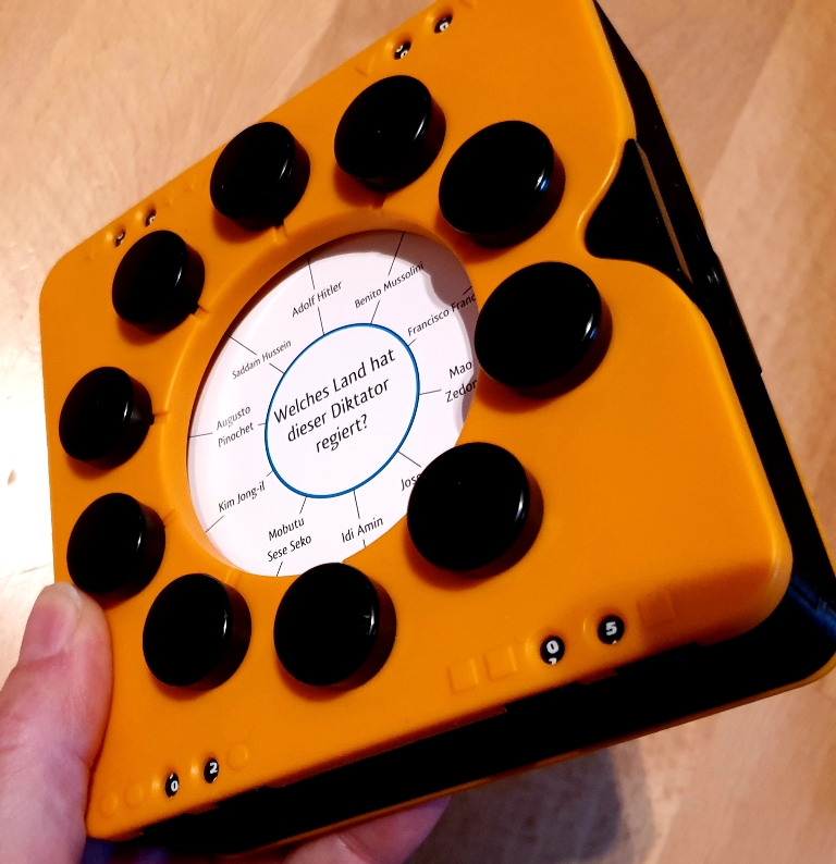 Dieser kleine Kasten mit seinen Knöpfen ist phänomenal. Ich bin wirklich froh, dass in den Regeln angegeben ist, dass er immer reihum weitergegeben werden muss. Denn sonst würden wohl kleine oder auch größere Kriege am Spieletisch stattfinden, weil jeder selbst an ihm herumspielen will. Denn die Smartbox in ihrer Form und Funktion spricht die Haptik rundum an. Nicht nur, dass es total klasse ist, sie in der Hand zu halten. Nein auch die Knöpfe haben es mir angetan. Sie herauszuziehen und wieder hereinzustecken macht richtig Spaß. So viel Spaß, dass – sollten alle gepasst haben – sogar noch die restlichen Knöpfe herausgezogen werden, um die fehlenden Antworten zu betrachten. Es ist ja nicht so, dass man nicht einfach die Karte herausholen und alles lesen könnte. Aber das ist nicht so witzig. Also einfach Knöpfe raus, Knöpfe rein.